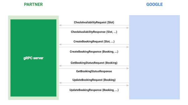 Implement an API interface based on gRPC. This allows Google to send booking requests. The API surface is defined using gRPC's protobuf based IDL.
