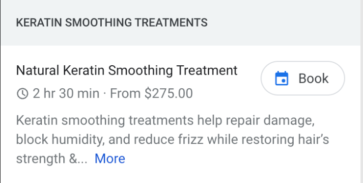 "value": "Keratin smoothing treatments repair damage, block humidity, and reduce frizz while restoring the hair’s strength & vibrance for healthier hair. Treatment times may vary."