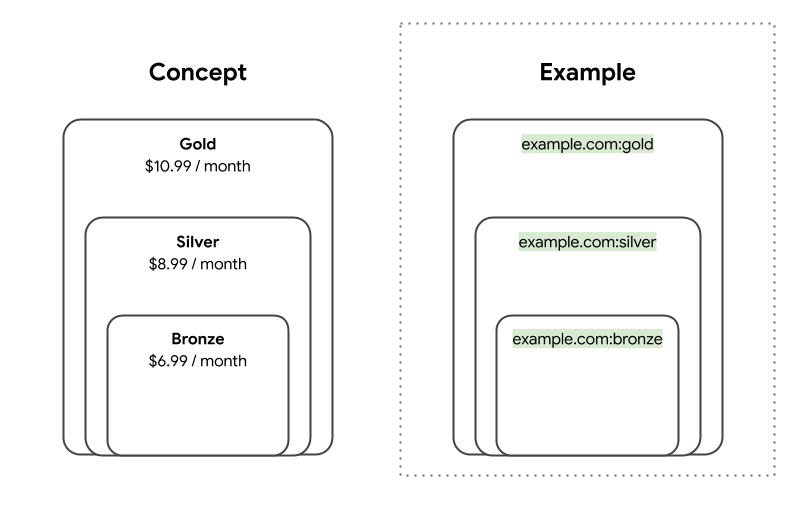"requiresSubscription": [ { "@type": "MediaSubscription", "@id": "https://www.example.com/package/bronze", "name": "Bronze", "sameAs": "https://www.example.com/package/bronze", "commonTier": true }, { "@type": "MediaSubscription", "@id": "https://www.example.com/package/silver", "name": "Silver", "sameAs": "https://www.example.com/package/silver", "identifier": "example.com:silver", "commonTier": false }, { "@type": "MediaSubscription", "@id": "https://www.example.com/package/gold", "name": "Gold", "sameAs": "https://www.example.com/package/gold", "identifier": "example.com:gold", "commonTier": false } ],