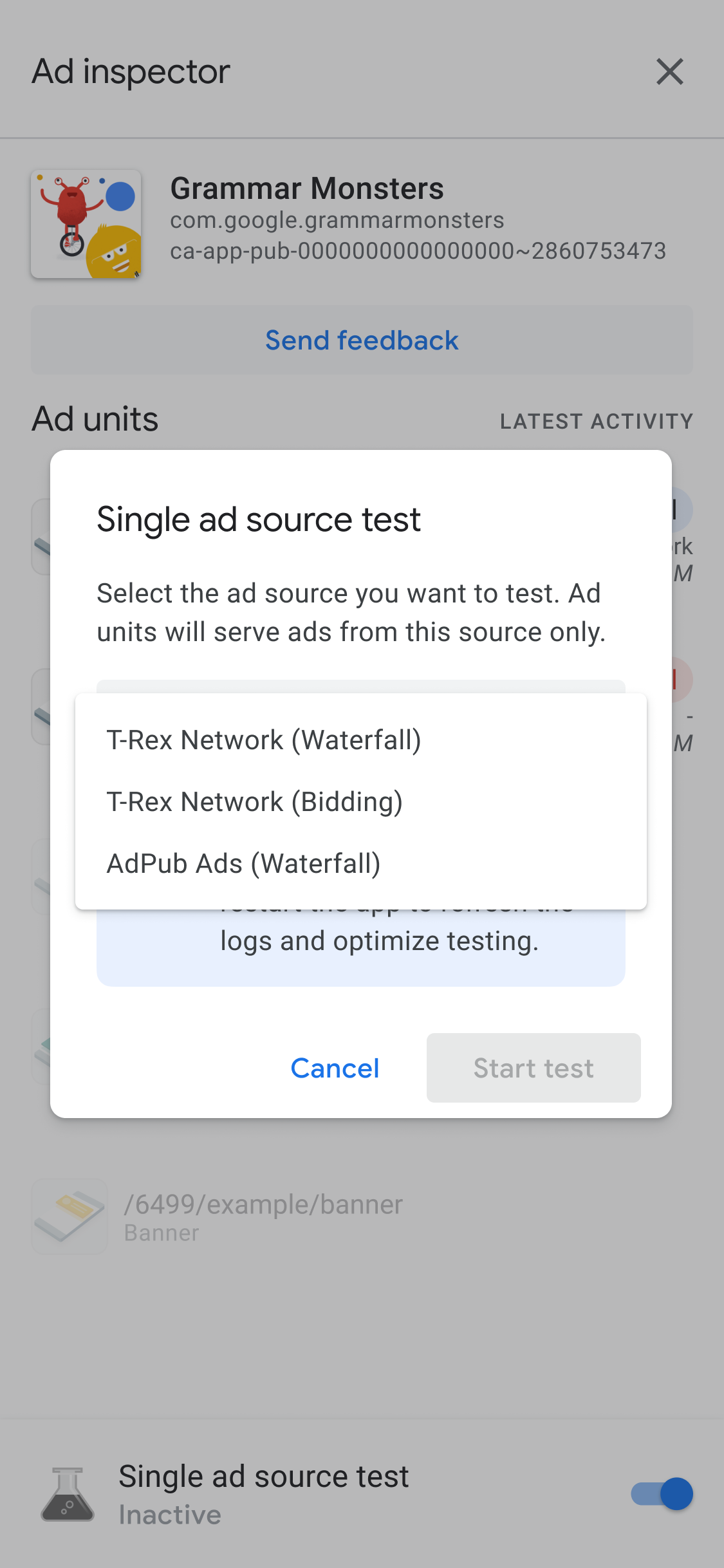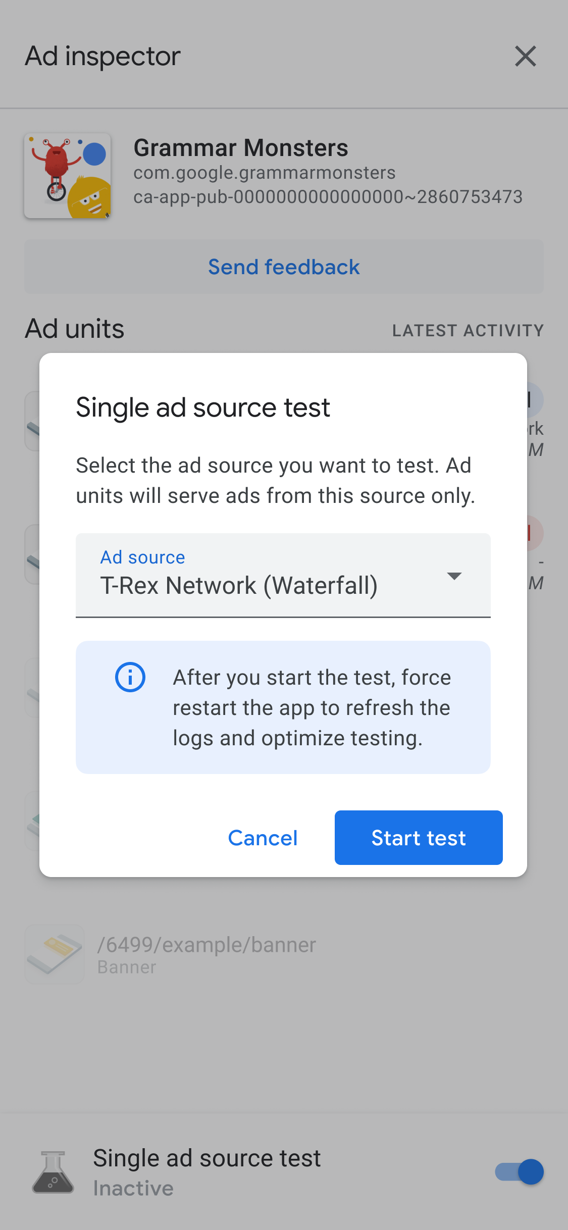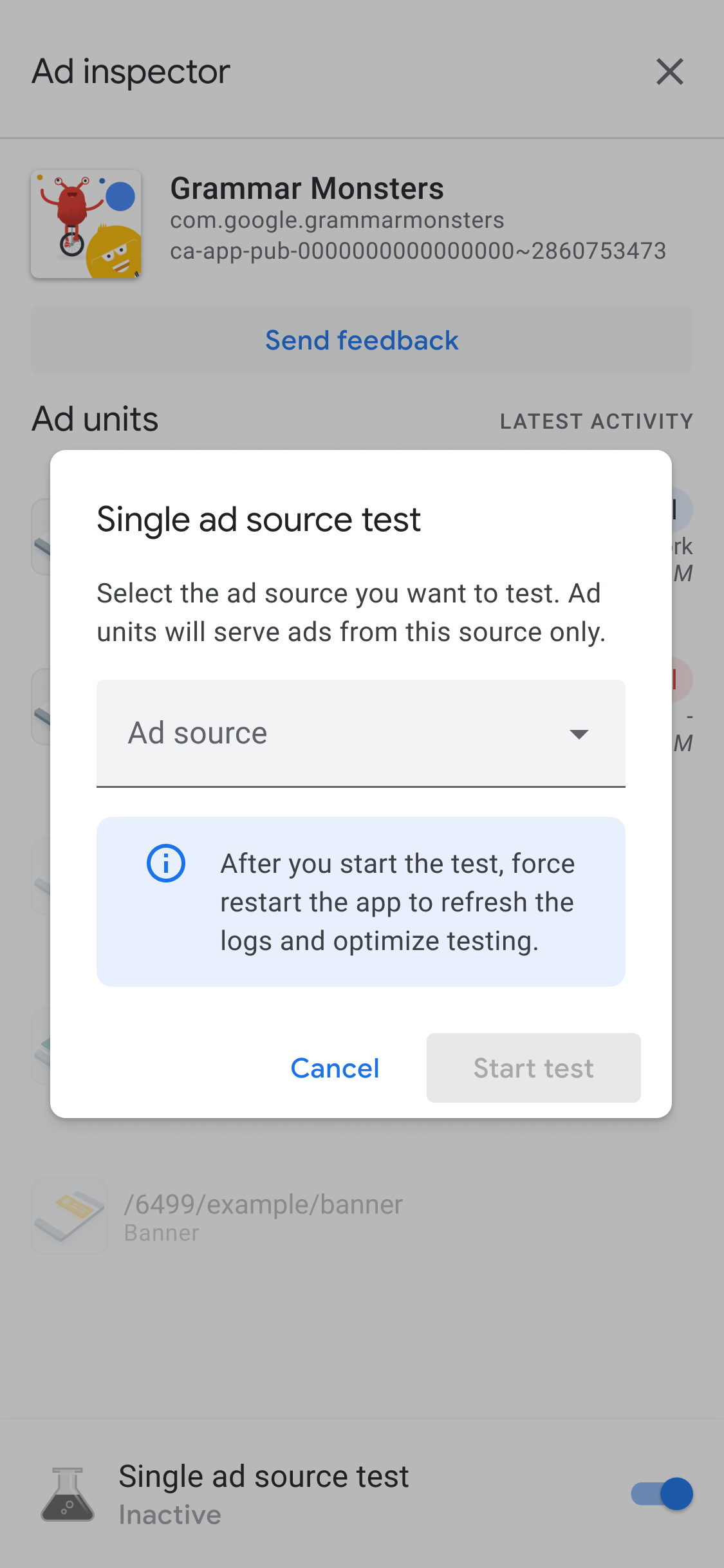 In Ad inspector, click the Single ad source test toggle. A Single ad source test dialog appears: