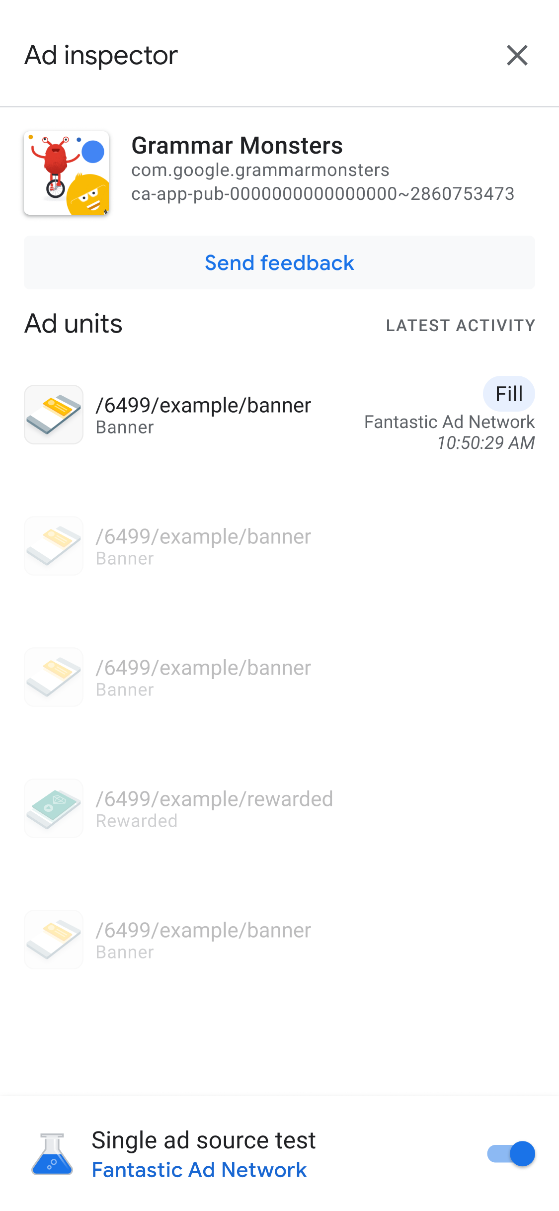 After restarting your app, all ad unit placements attempt to show an ad from the selected ad source. Launching ad inspector when a single ad source test is active shows the active test ad source: