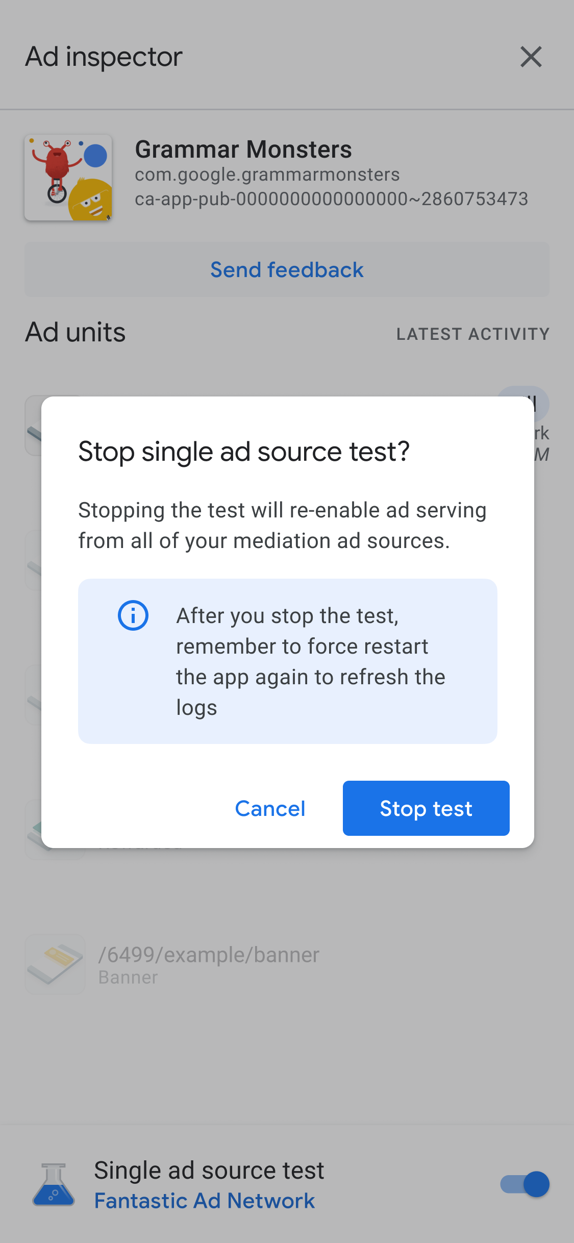 - In Ad inspector, click off the Single ad source test toggle. The Stop single ad source test? dialog appears.