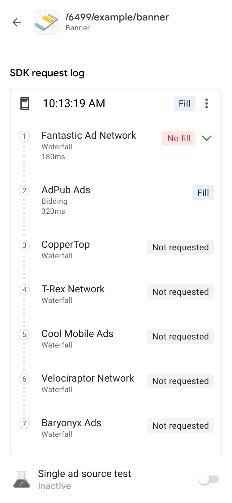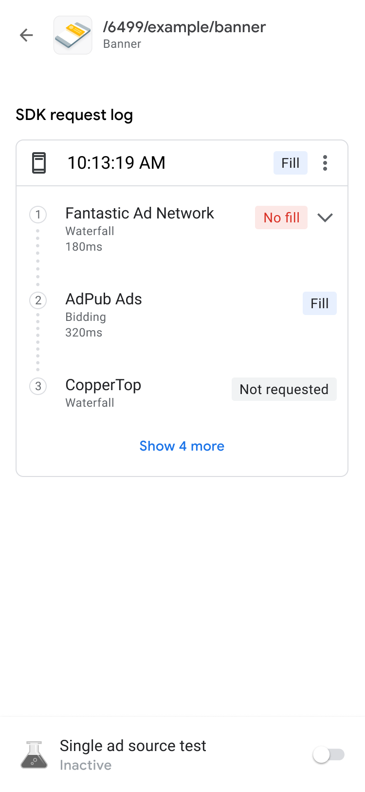 In the Ad Units tab, tap on an ad unit to view its SDK request log. The SDK request log shares details about the waterfall from the ad request, such as when the ad filled, which ad source filled, or if the waterfall ended without a fill.