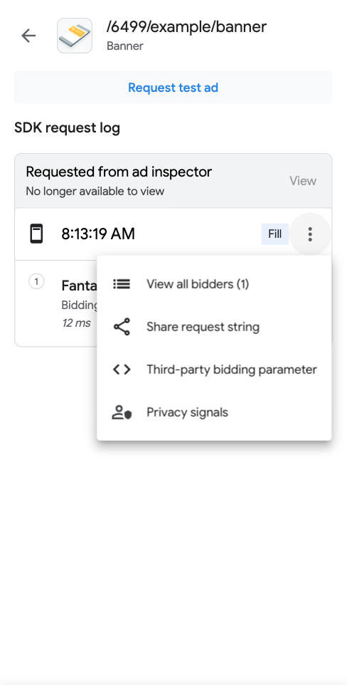 In SDK request log, you see the bidding ad sources called in an ad request. To view the details of each ad source in the bidding auction, tap more_vert and click View all bidders: