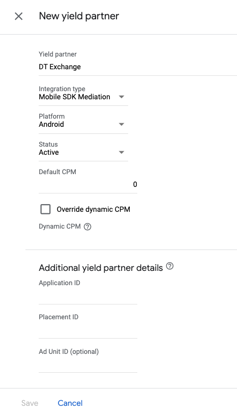 Enter the Application ID and Placement ID obtained in the previous section, and the Default CPM value. Click Save.