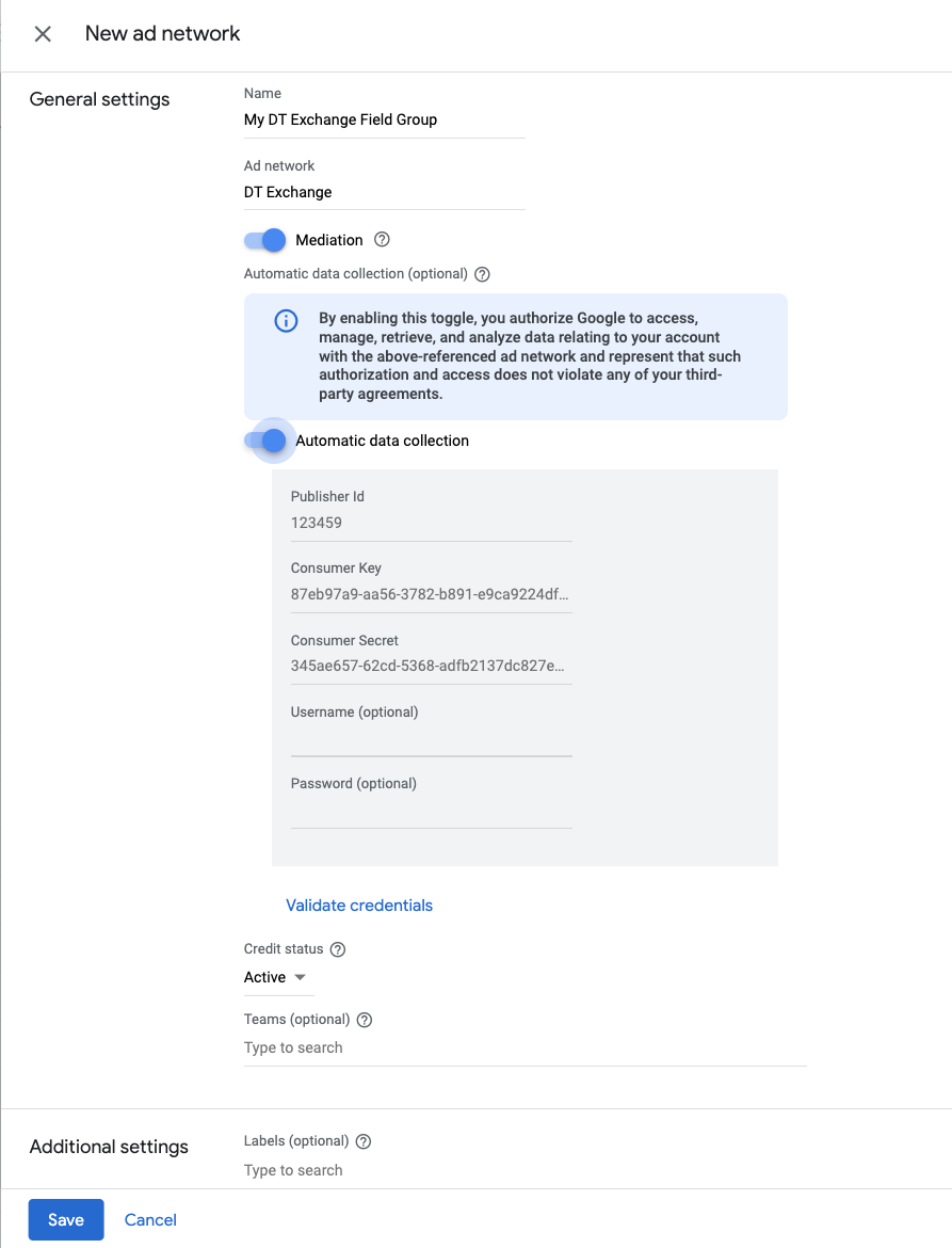 Select DT Exchange as the Ad network, enter a unique Name and enable Mediation. Turn on Automatic data collection, and enter the Publisher ID, Consumer Secret and Consumer Key obtained in the previous section.