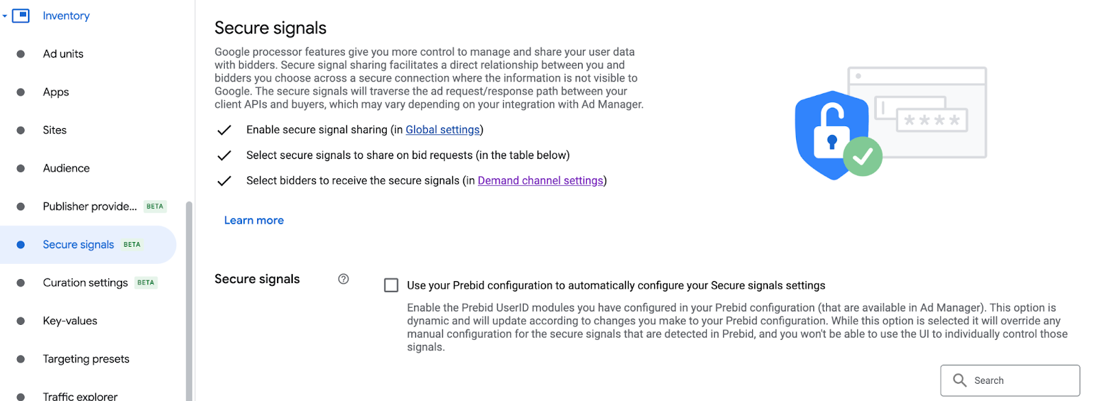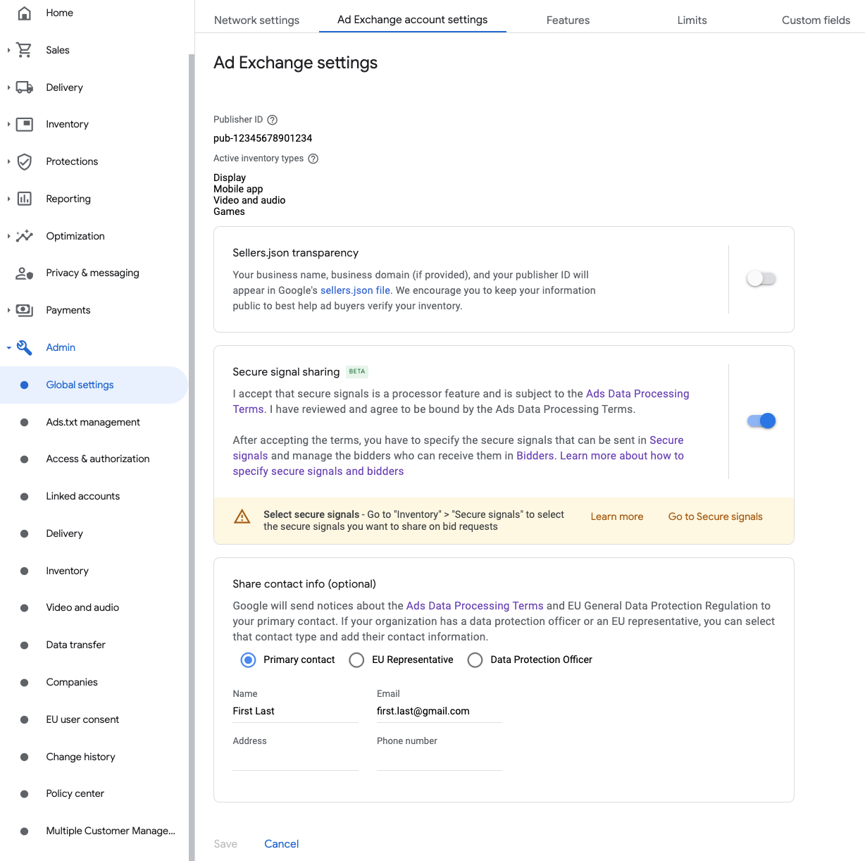 Navigate to Admin > Global settings. Go to the Ad Exchange account settings tab and review and toggle on Secure signal sharing. Click Save.