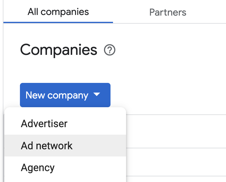 Navigate to Admin > Companies, then click the New company button in the All companies tab. Select Ad network.