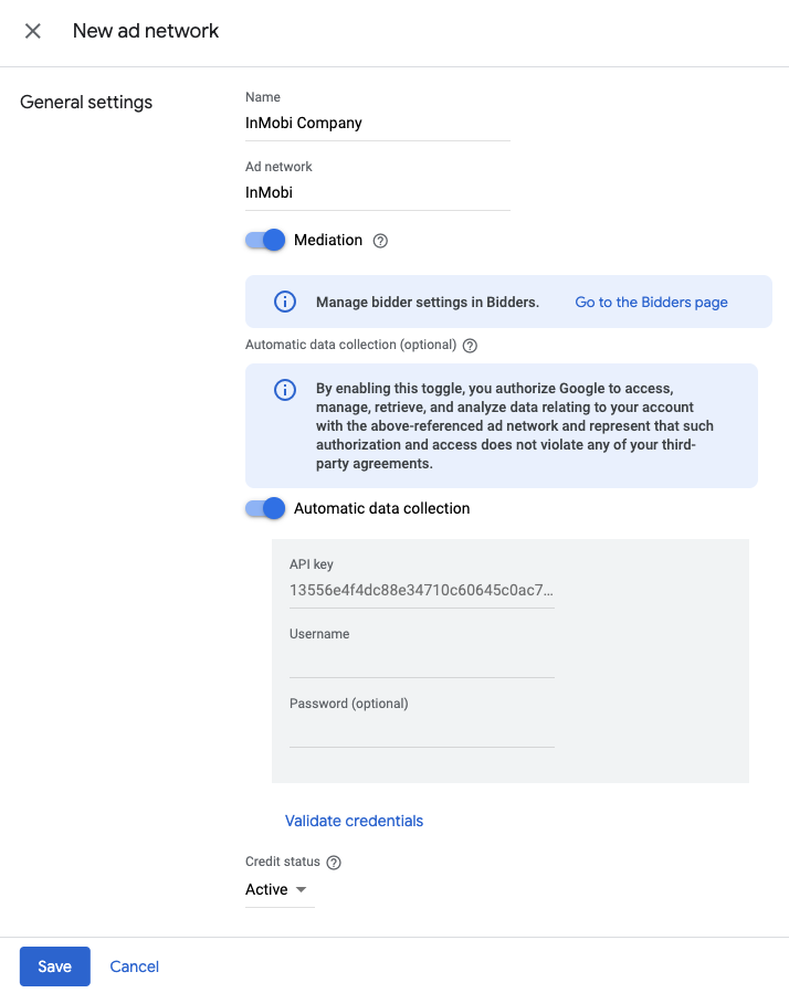 Select InMobi as the Ad network, enter a unique Name and enable Mediation. Turn on Automatic data collection, and enter the Username and API Key obtained in the previous section.