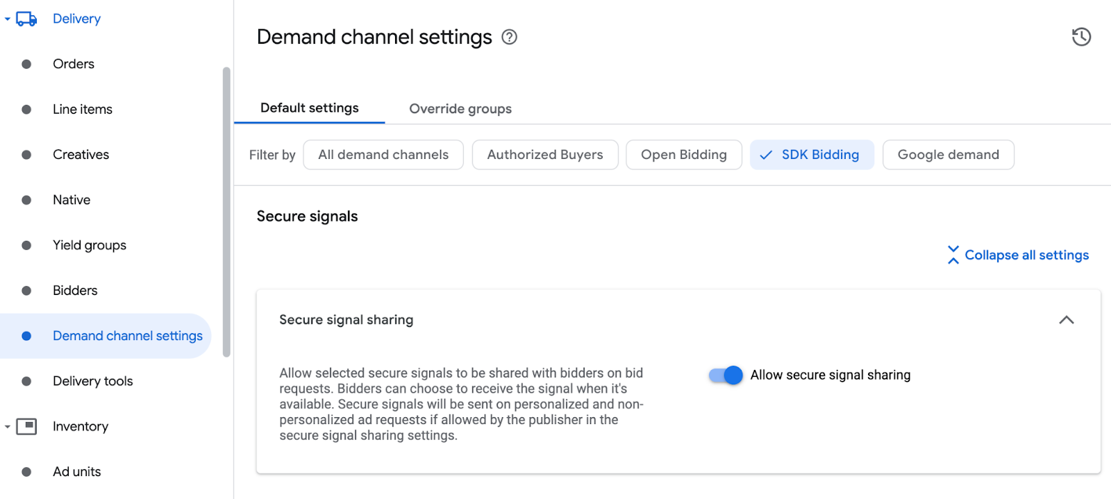 Navigate to Delivery > Demand channel settings. In the Default settings tab, toggle on Allow secure signal sharing for SDK Bidding.