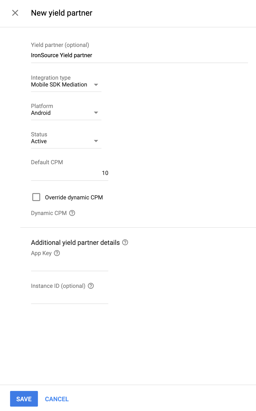 Once the Yield partner is selected, choose Mobile SDK Mediation as the Integration type, Android as the Platform, and Active as the Status. Enter the App Key and Instance ID obtained in the previous section. Then, enter a Default CPM value.