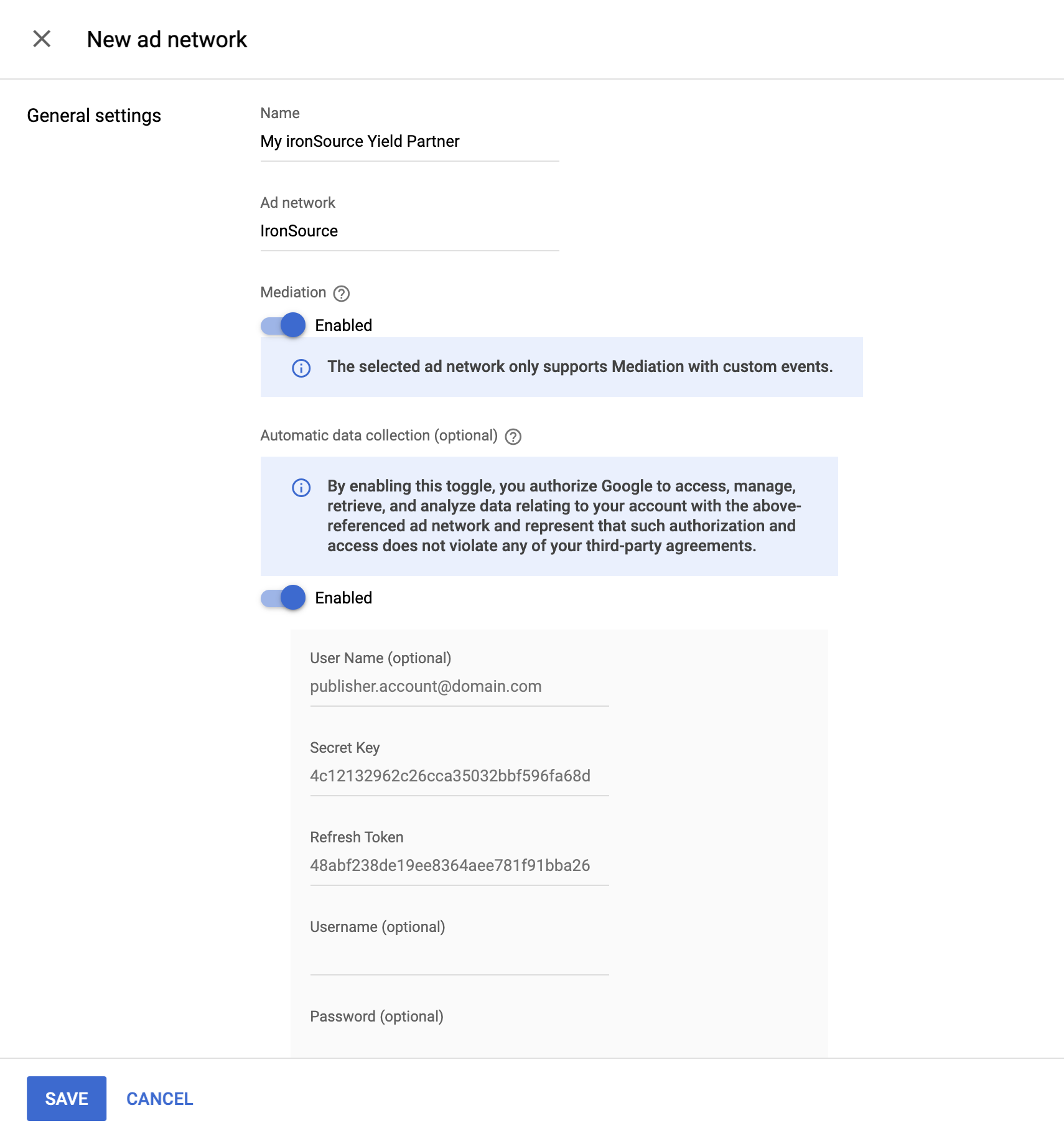 Select ironSource Ads as the Ad network, enter a unique Name and enable Mediation.