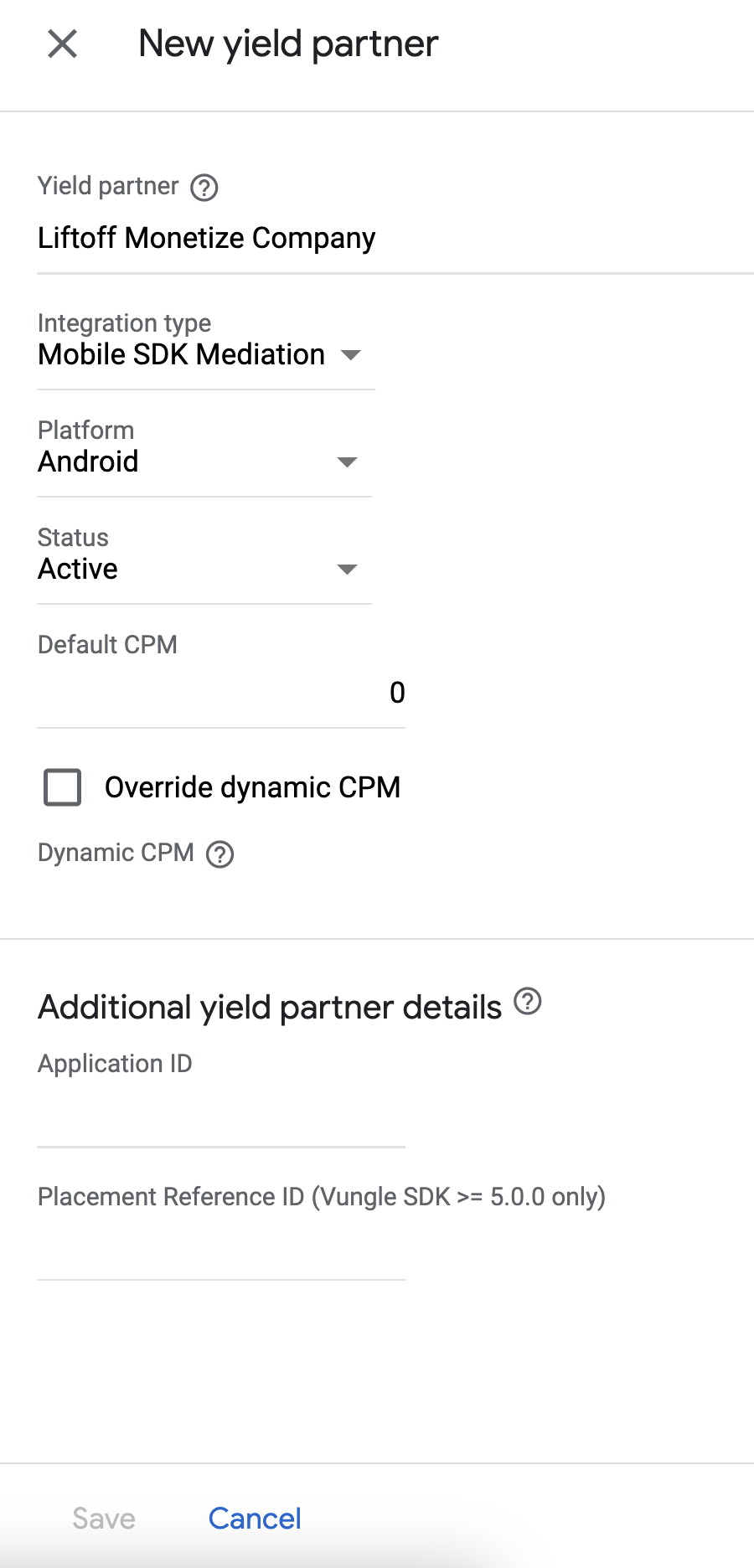 Enter the Application ID and Placement Reference ID obtained in the previous section, and the Default CPM value. Click Save.