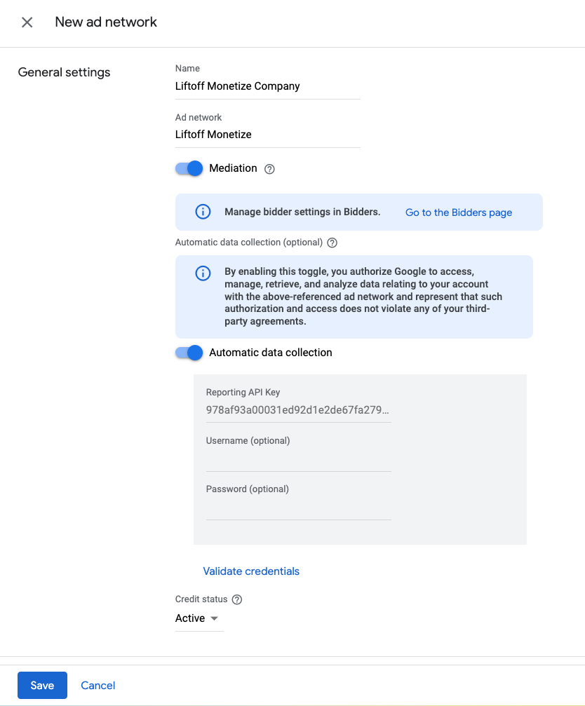 Select Liftoff Monetize as the Ad network, enter a unique Name and enable Mediation. Turn on Automatic data collection, and enter the Reporting API Key obtained in the previous section.