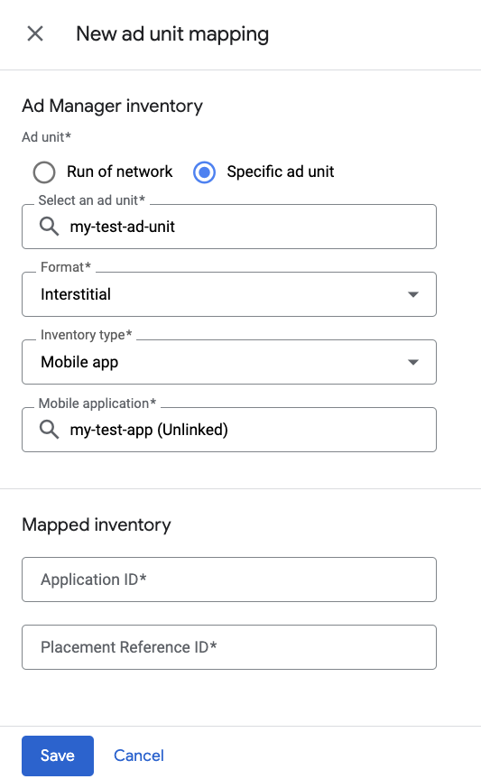 Choose Specific ad unit. Select an ad unit and format, Mobile app as the Inventory type, and your Mobile application. Then, enter Application ID and Placement Reference ID obtained in the previous section. Finally, click Save.