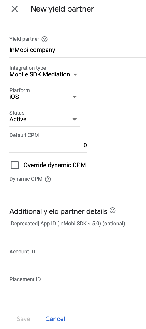 Select the company you created for InMobi in the previous section. Choose Mobile SDK mediation as the Integration type, iOS as the Platform, and Active as the Status.