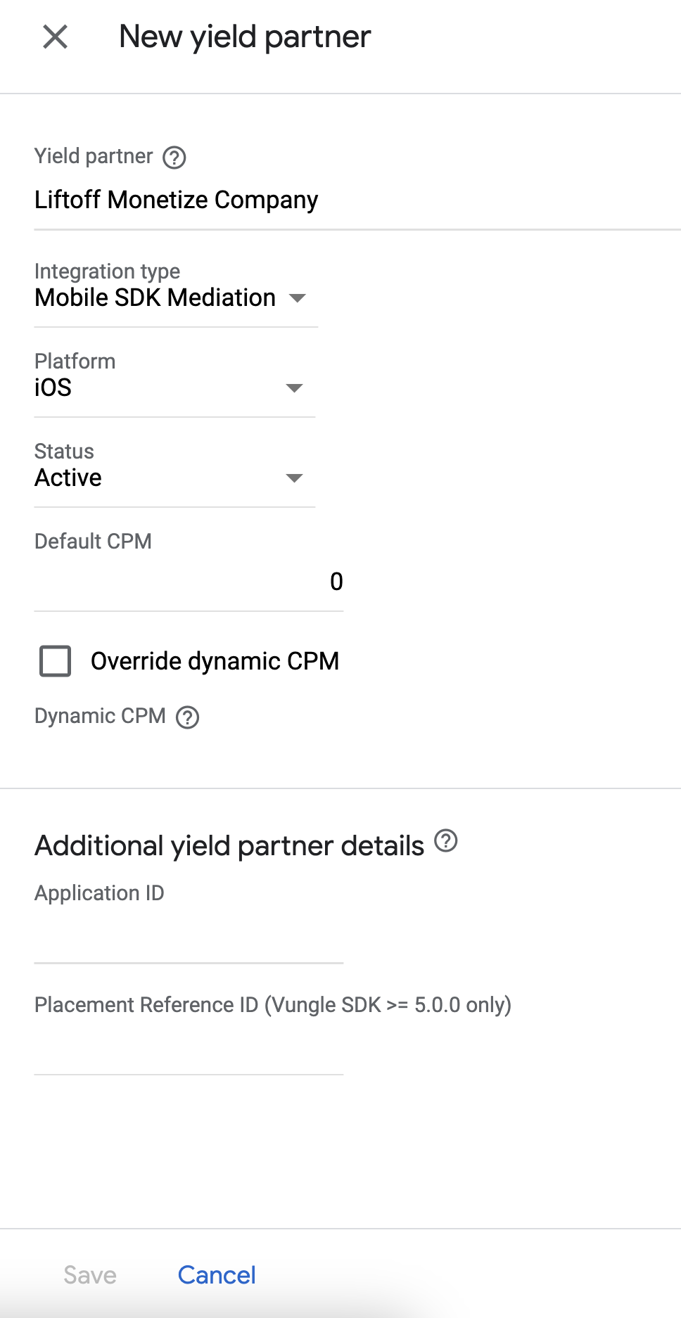 Enter the Application ID and Placement Reference ID obtained in the previous section, and the Default CPM value. Click Save.