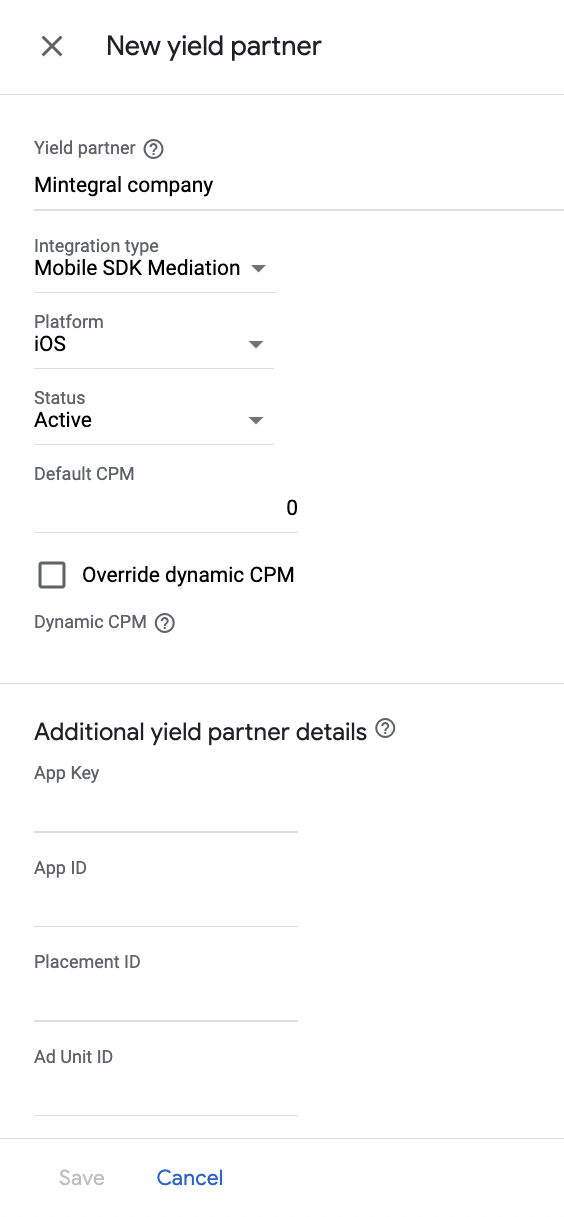 Select the company you created for Mintegral in the previous section. Choose Mobile SDK mediation as the Integration type, iOS as the Platform, and Active as the Status.