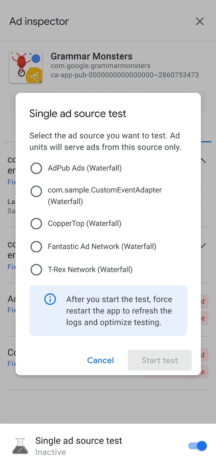 In Ad inspector, click the Single ad source test toggle. A Single ad source test dialog appears: