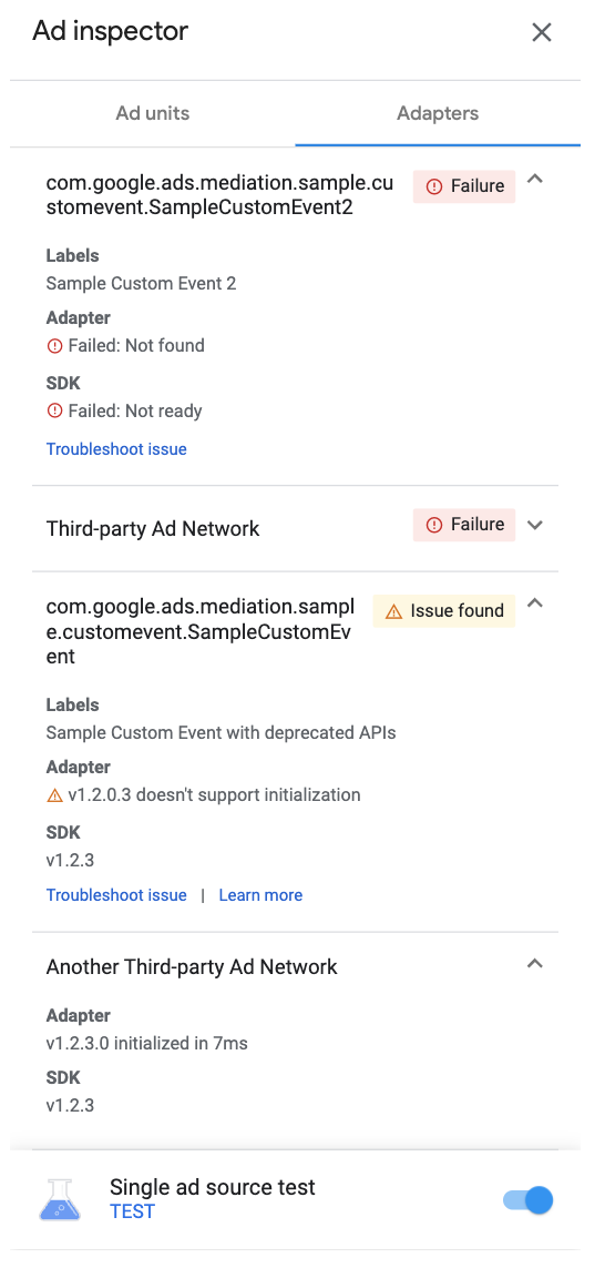 The Ad inspector displays a list of all configured ad source adapters and allows you to view their initialization statuses and versions.