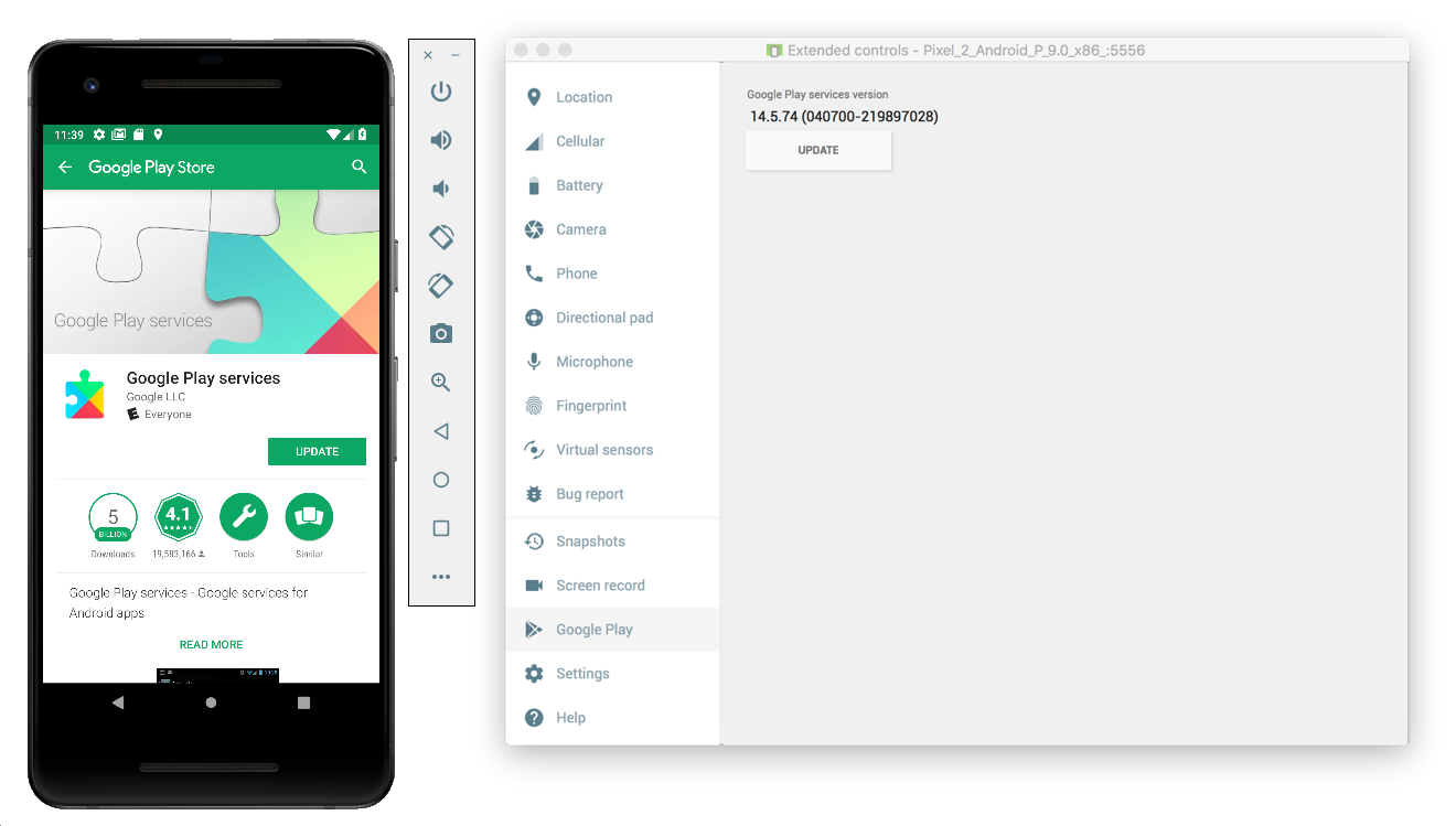 Updating Google Play services requires either updating Android Studio and system images for emulators or using the Google Play app for physical devices.