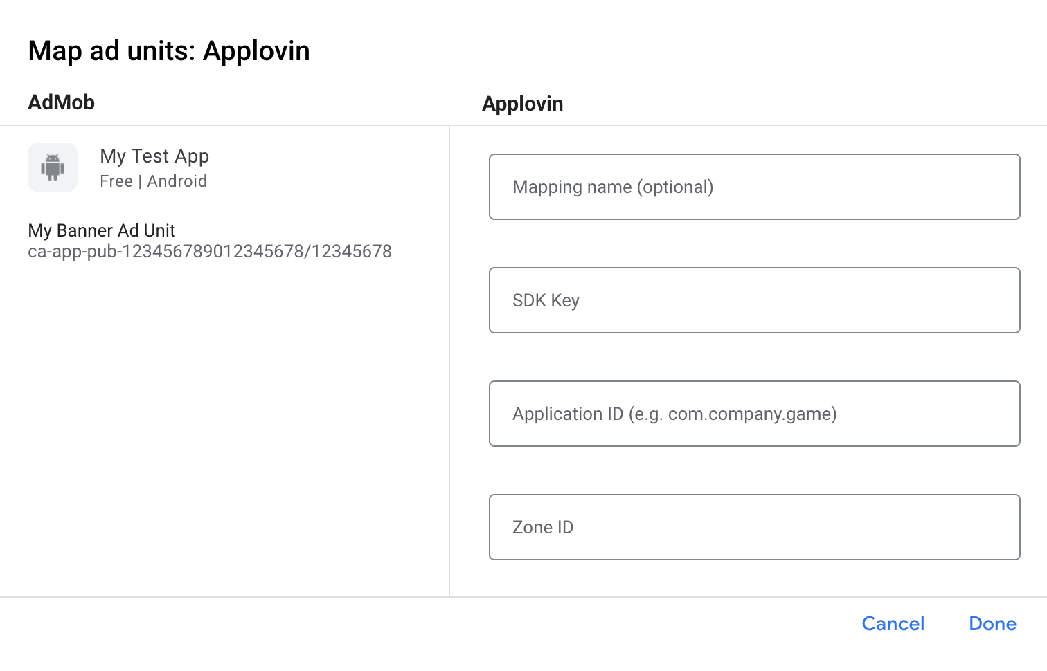 Next, enter the Application ID of your app along with the SDK Key and the Zone ID obtained in the previous section. Then click Done.