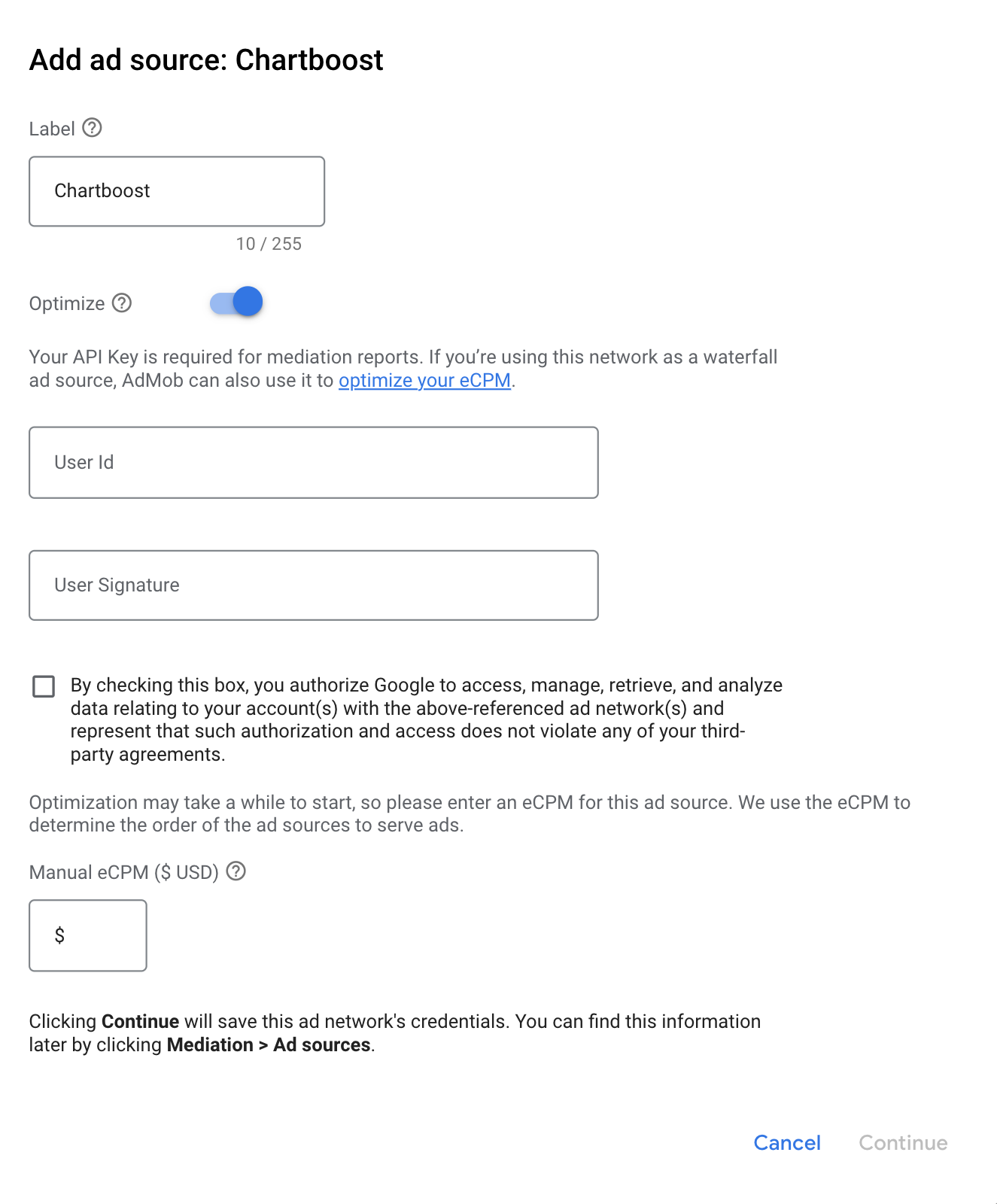 Select Chartboost and enable the Optimize switch. Enter the User ID and User Signature obtained in the previous section to set up ad source optimization for Chartboost. Then enter an eCPM value for Chartboost and click Continue.