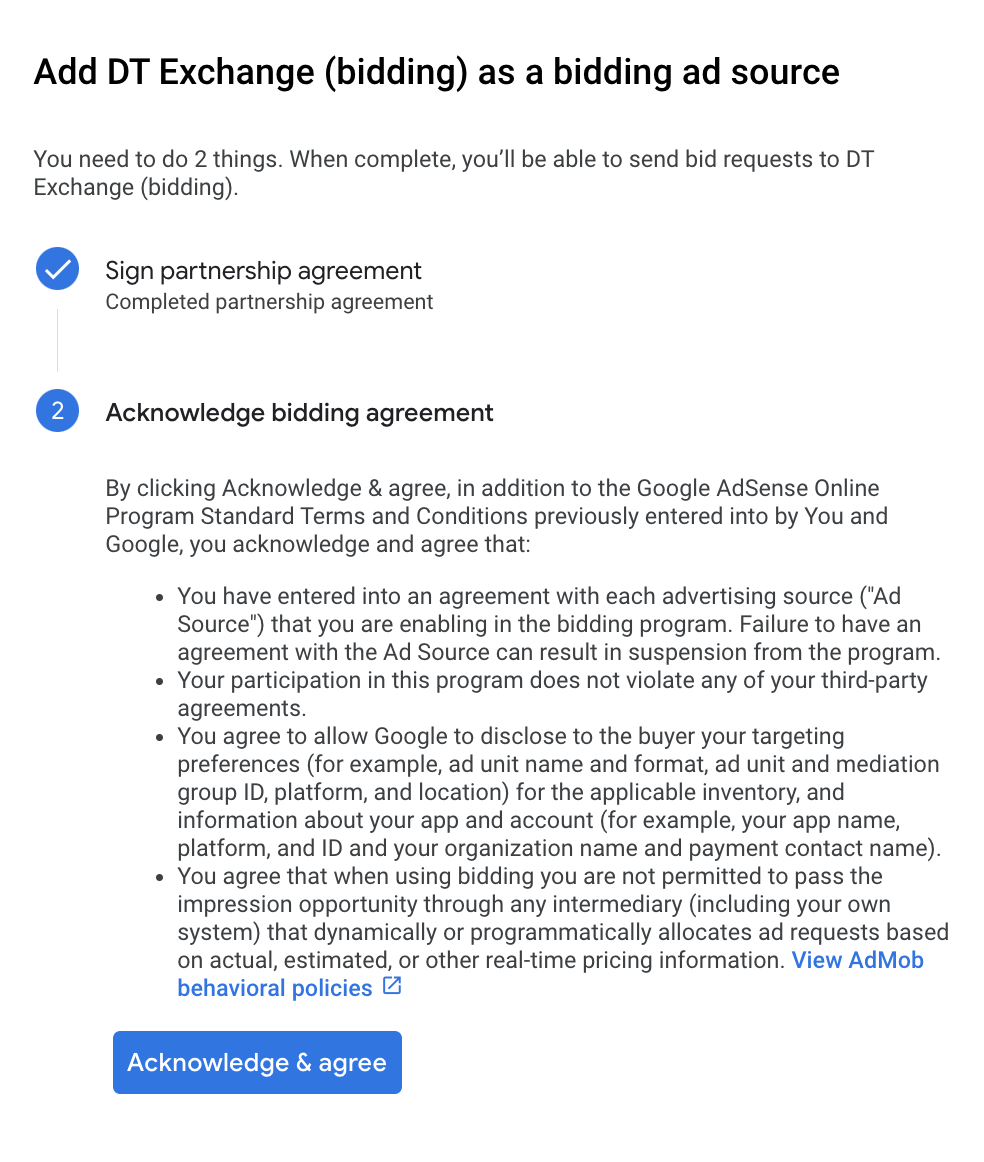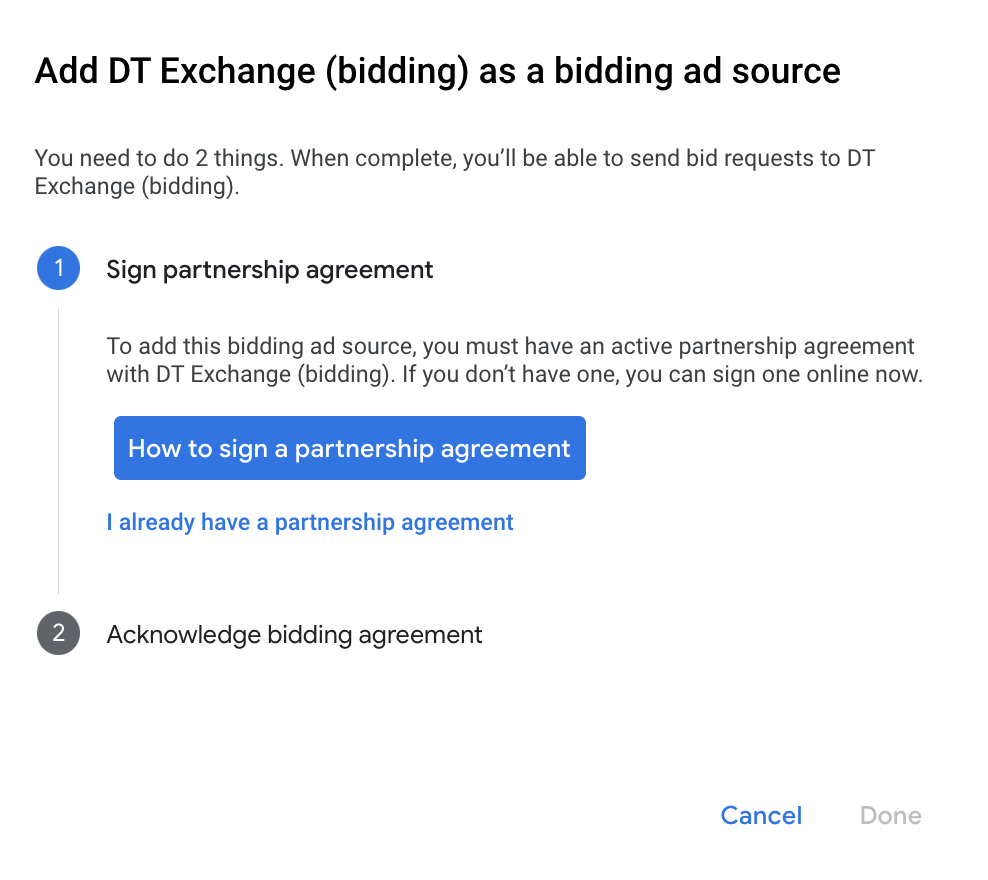 Under the Bidding card in the Ad Sources section, select Add ad source. Then select DT Exchange .Click How to sign a partnership agreement and set up a bidding partnership with DT Exchange.