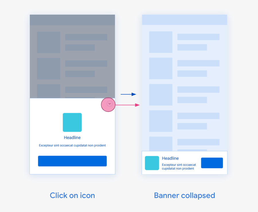 Collapsible banner ads initially appear as a larger overlay with a button to collapse them to their original size, aimed at improving performance for smaller anchored ads.
