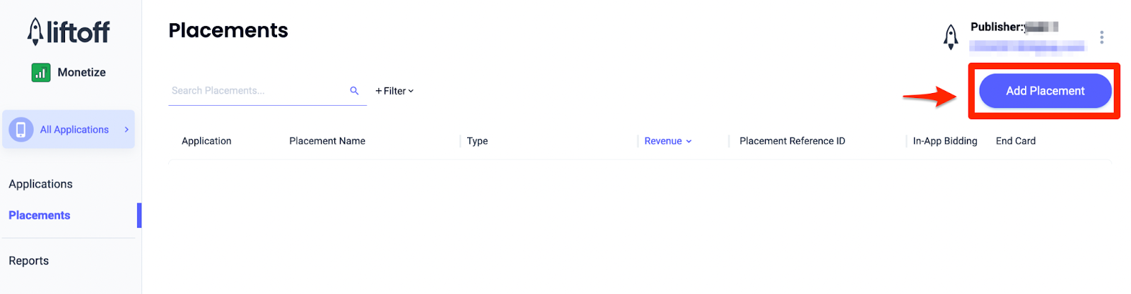To create a new placement to be used with AdMob Mediation, navigate to the Liftoff Monetize Placements dashboard, click the Add Placement button and select your app from the drop-down list.