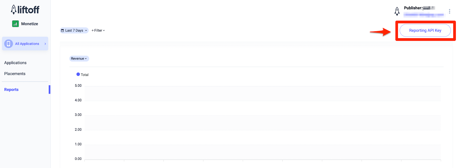 In addition to the App ID and the Reference ID, you'll also need your Liftoff Monetize Reporting API Key to set up your AdMob ad unit ID. Navigate to the Liftoff Monetize Reports dashboard and click the Reporting API Key button to view your Reporting API Key.