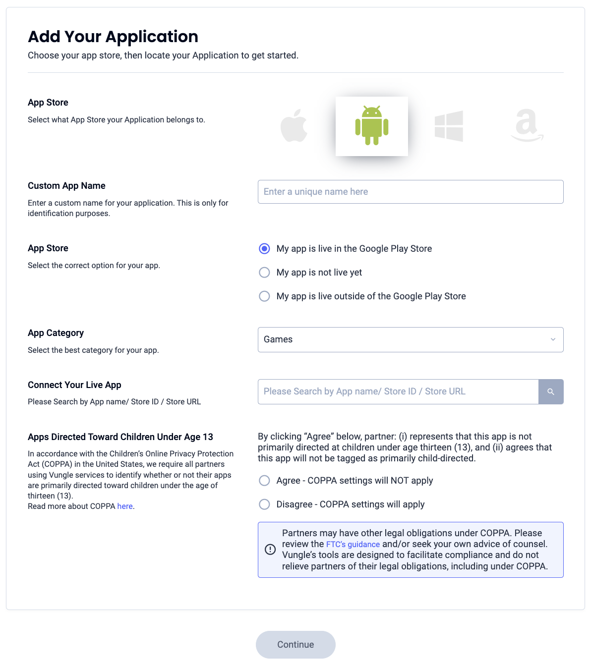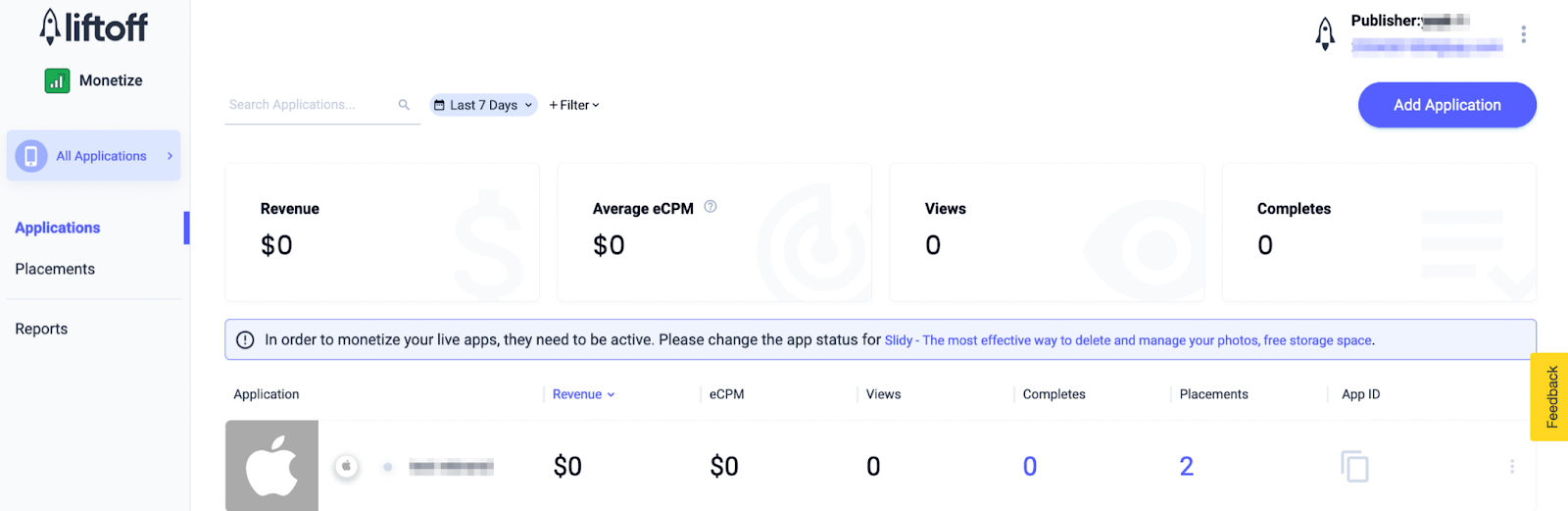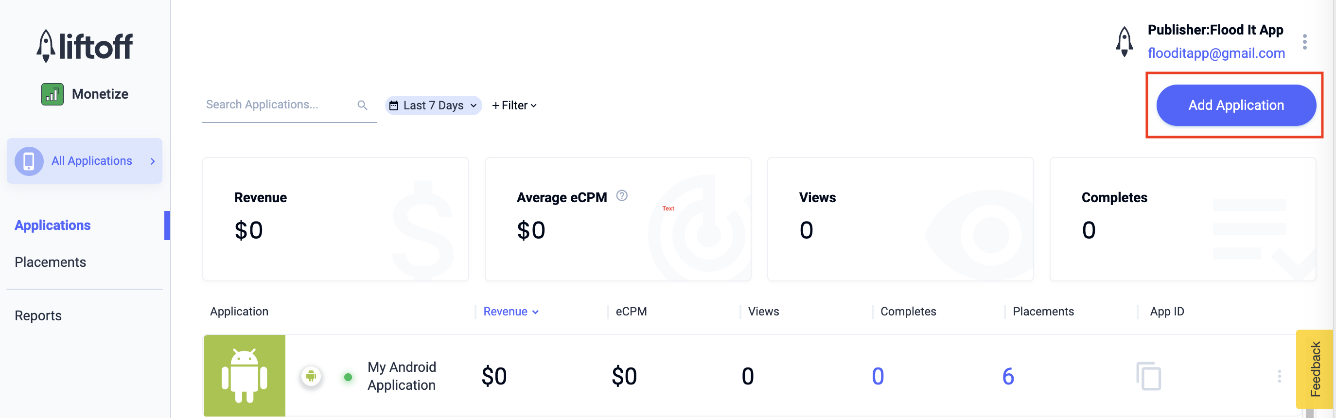Add your app to the Liftoff Monetize dashboard by clicking the Add Application button.