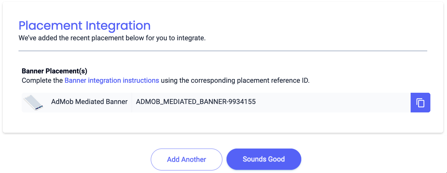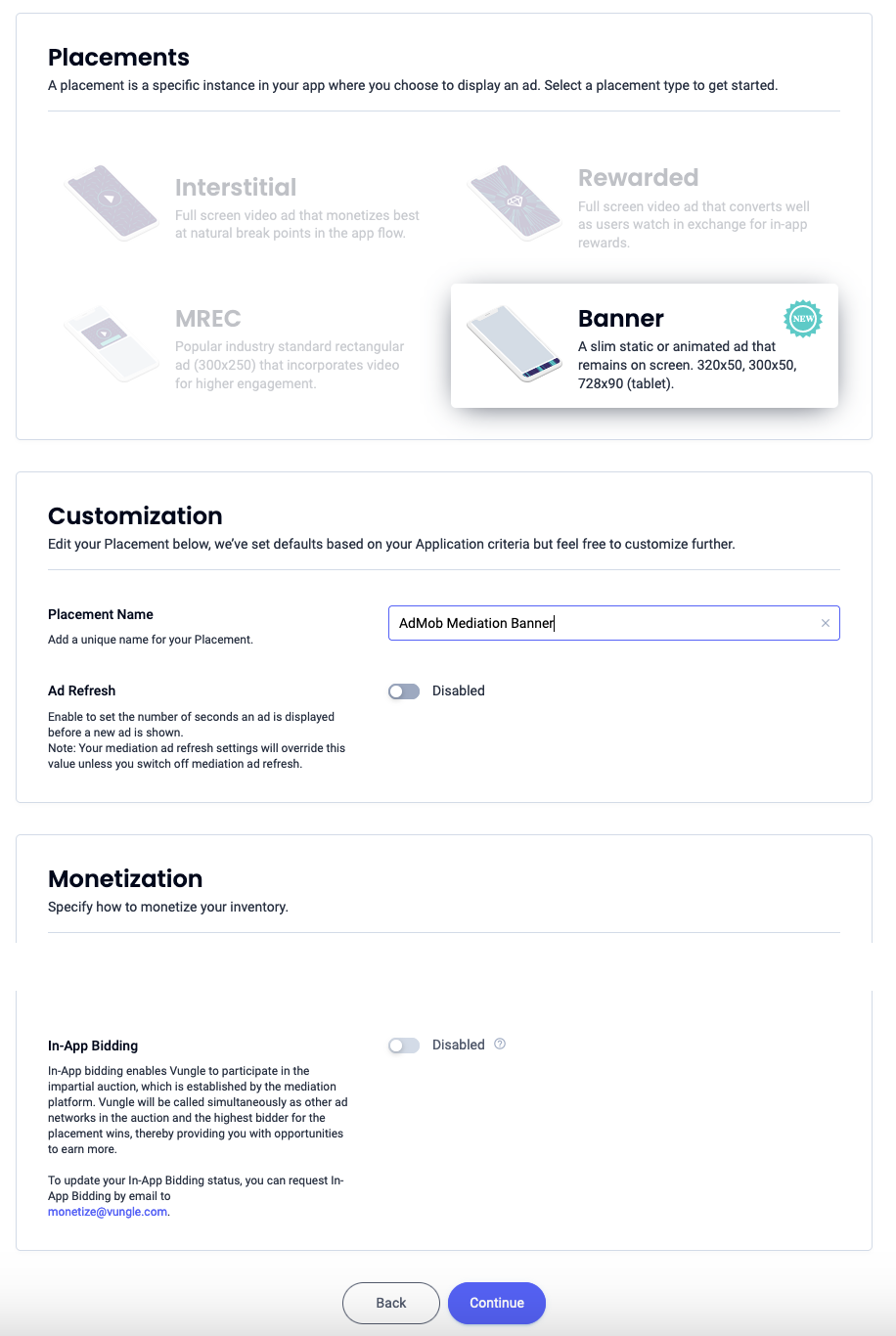 Select Banner, enter a Placement Name and fill out the rest of the form. [Bidding only] Under Monetization, toggle the In-App Bidding switch to Enabled. Click the Continue button at the bottom of the page to create the placement.