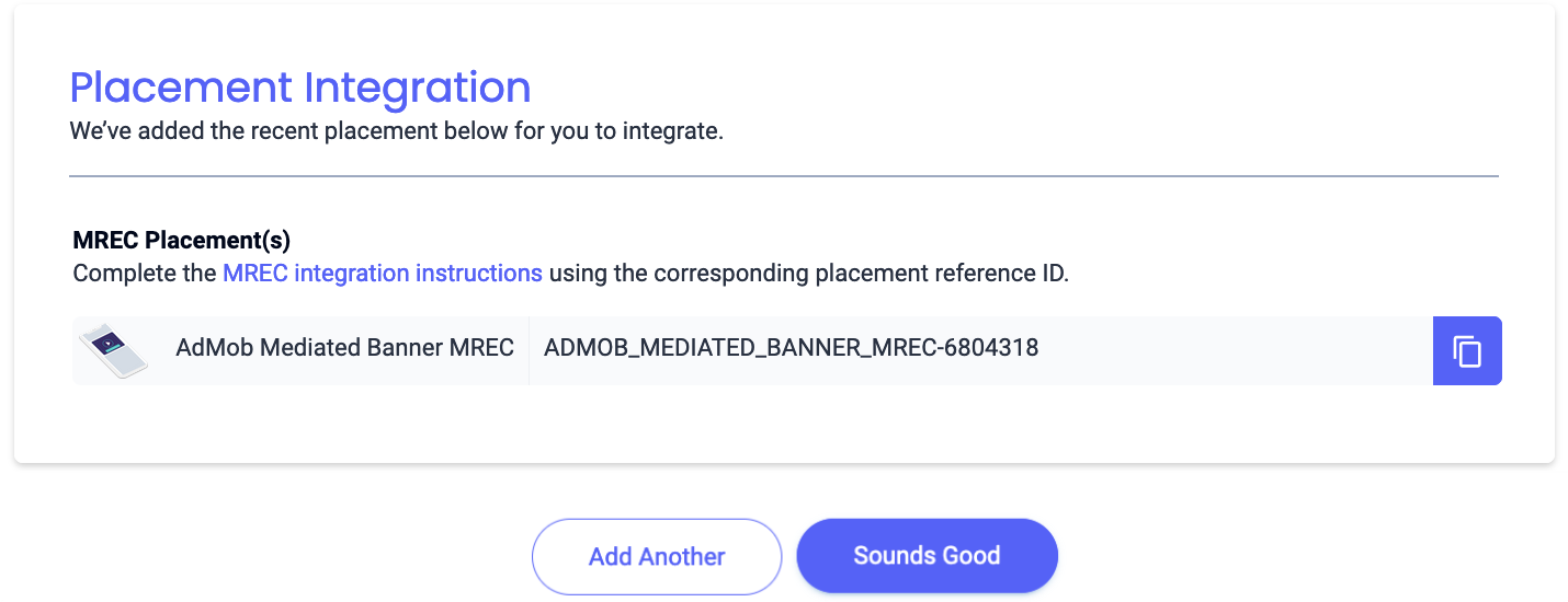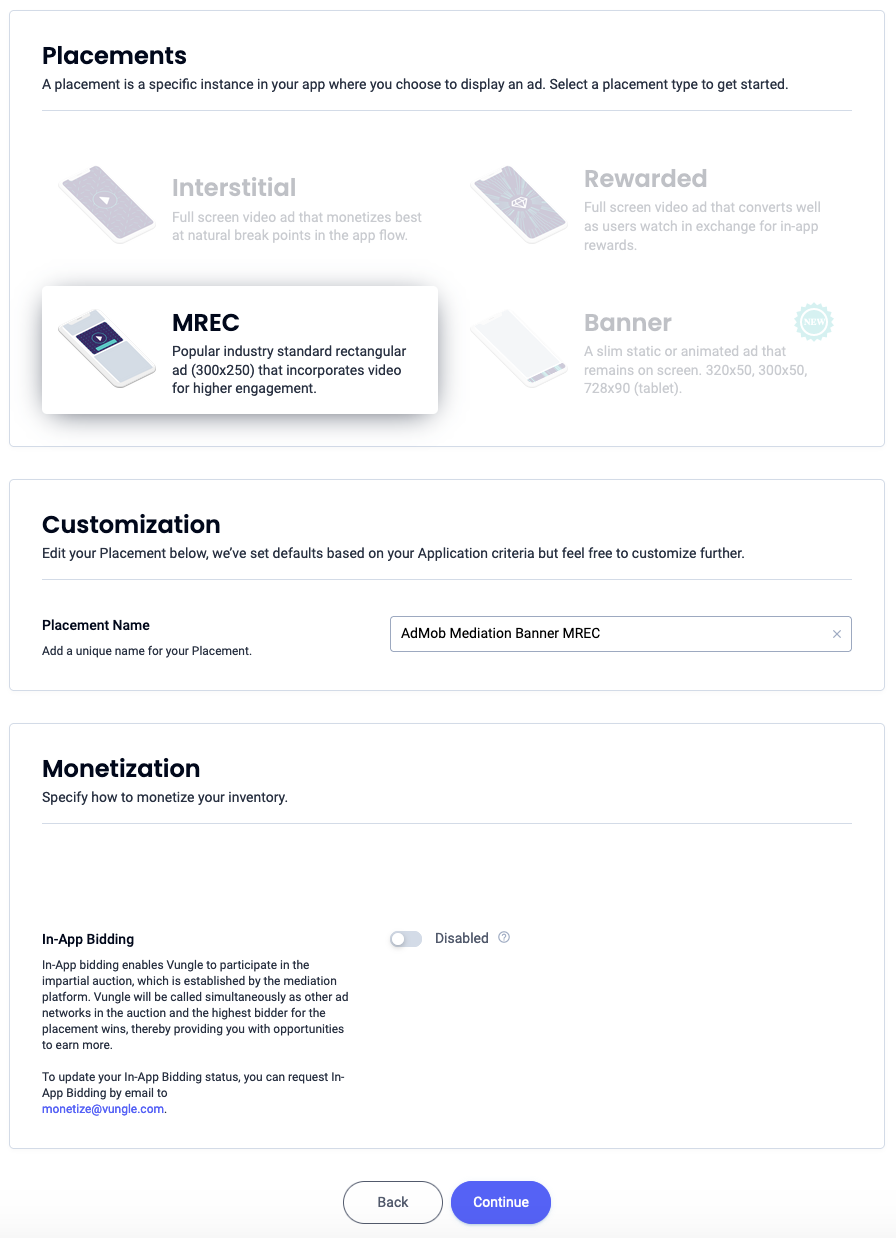 Select MREC, enter a Placement Name and fill out the rest of the form. [Bidding only] Under Monetization, toggle the In-App Bidding switch to Enabled. Click the Continue button at the bottom of the page to create the placement.