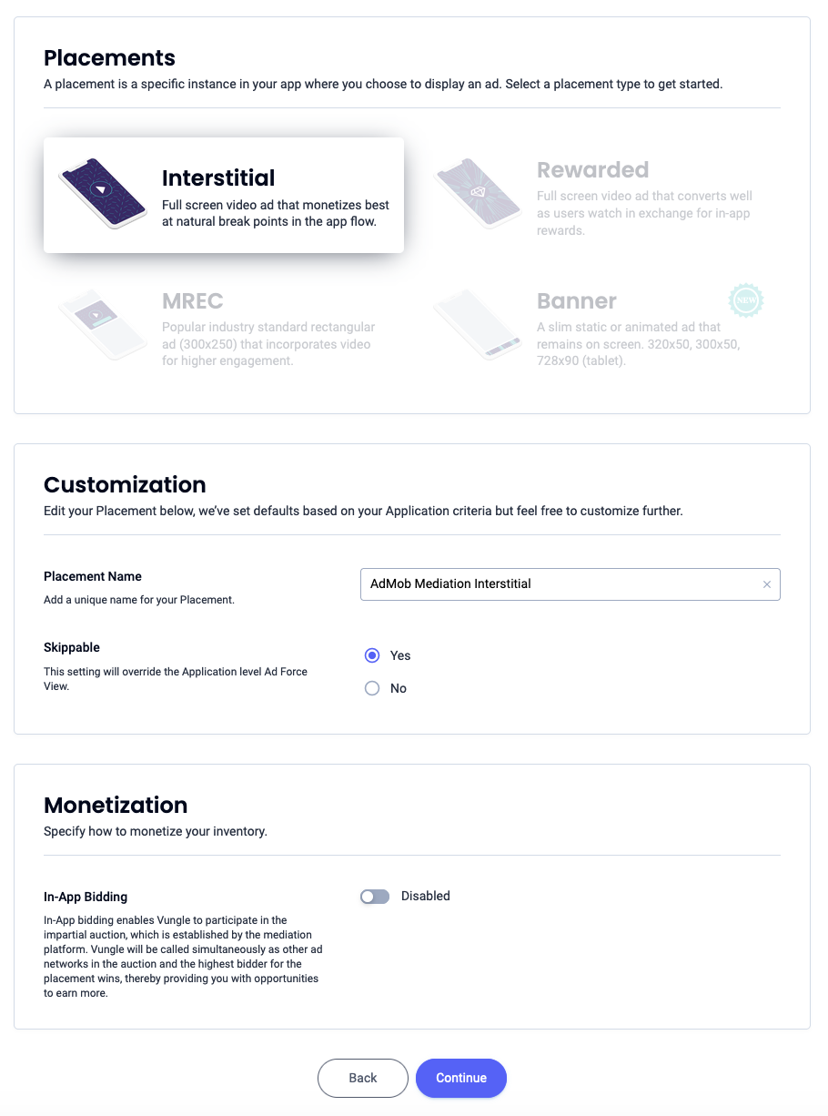 Select Interstitial and enter a Placement Name. Then, select Yes for Skippable and fill out the rest of the form. [Bidding only] Under Monetization, toggle the In-App Bidding switch to Enabled. Click the Continue button at the bottom of the page to create the placement.