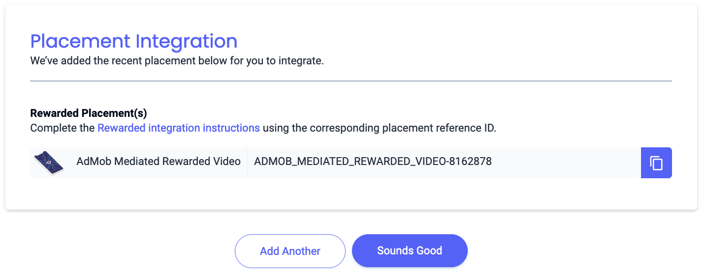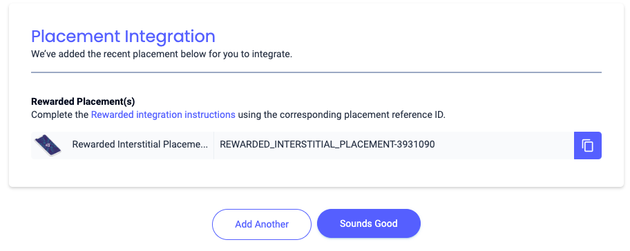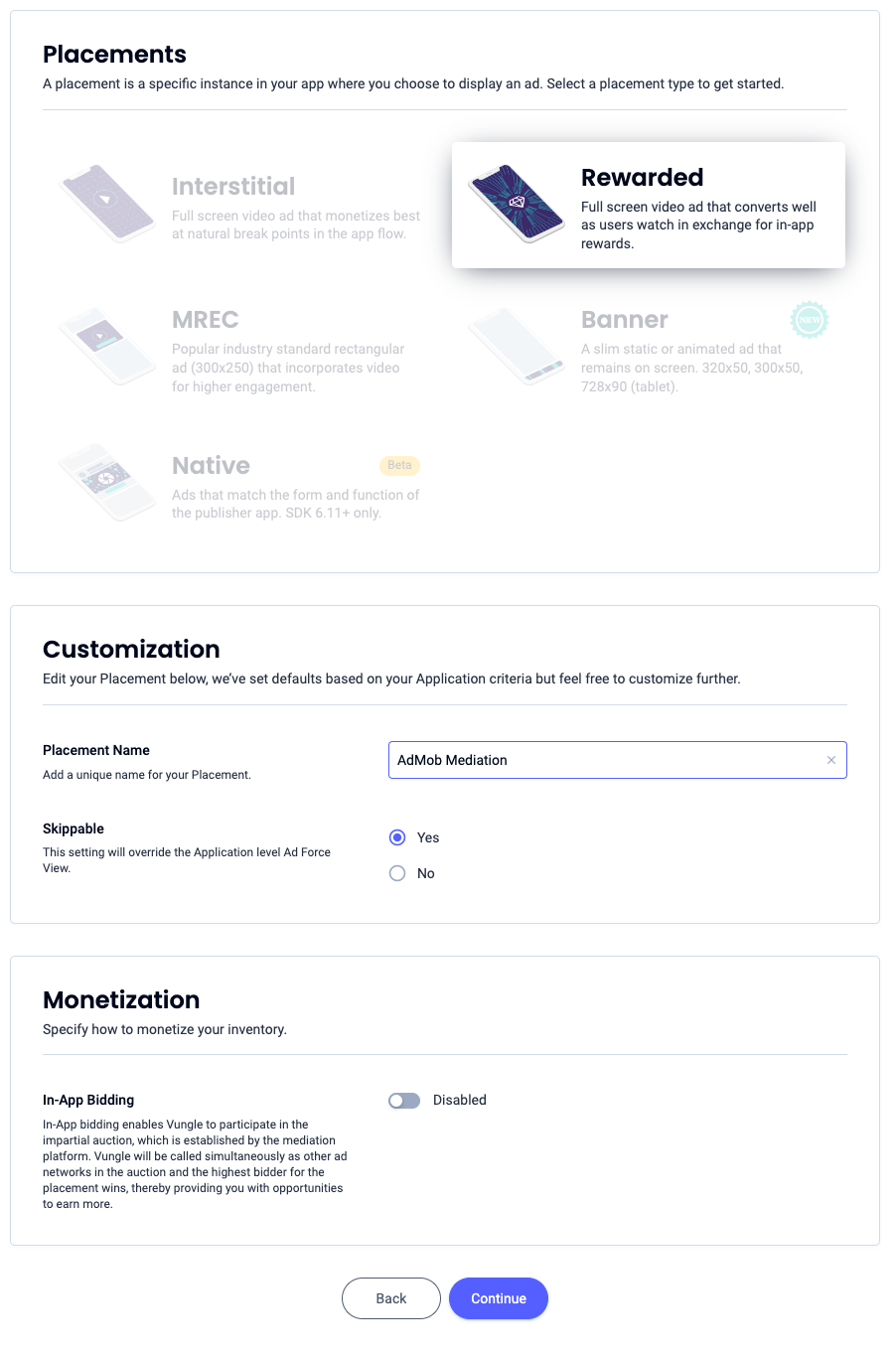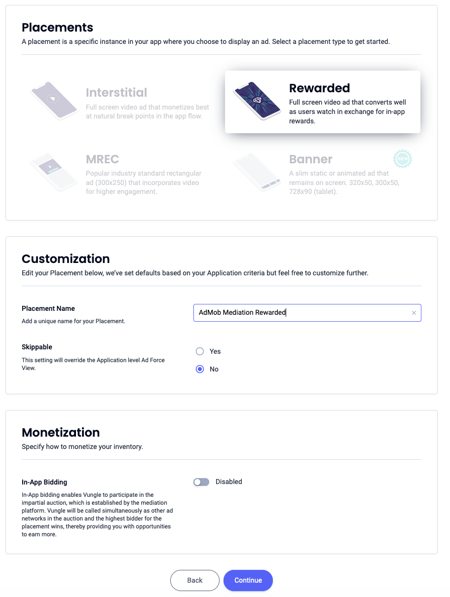 Select Rewarded. Enter a Placement Name, enable Skippable and fill out the rest of the form. [Bidding only] Under Monetization, toggle the In-App Bidding switch to Enabled. Click the Continue button at the bottom of the page to create the placement.