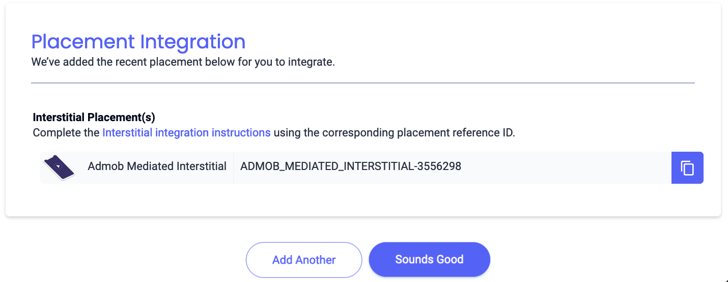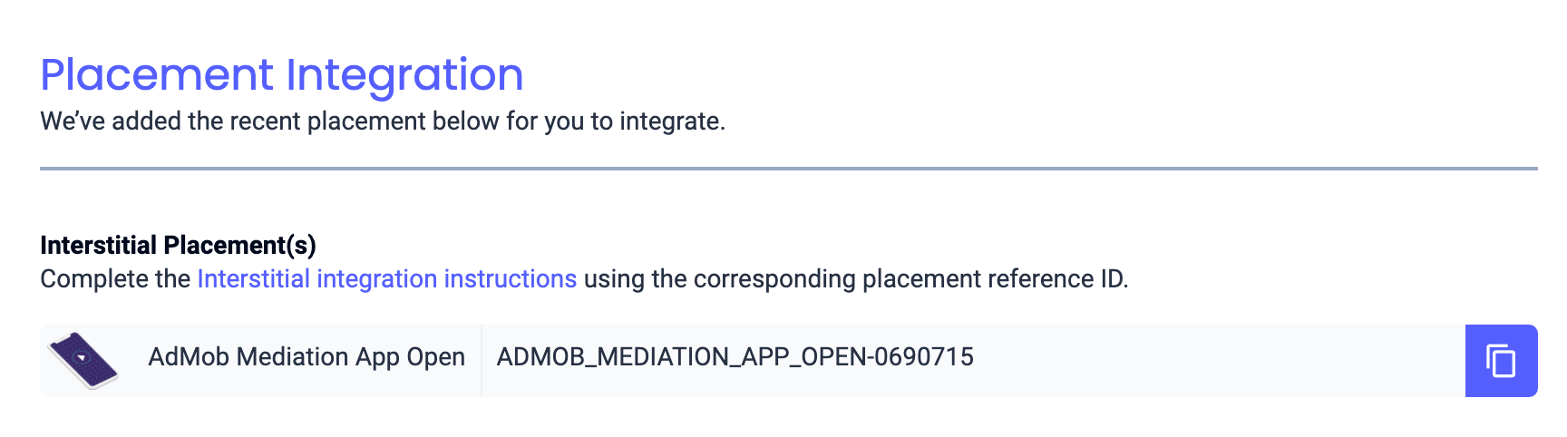Select Interstitial, enter a Placement Name, and fill out the rest of the form. [Bidding only] Under Monetization, toggle the In-App Bidding switch to Enabled. Click the Continue button at the bottom of the page to create the placement.