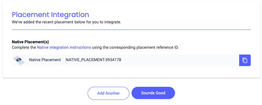 Select Native, enter a Placement Name and fill out the rest of the form. [Bidding only] Under Monetization, toggle the In-App Bidding switch to Enabled. Click the Continue button at the bottom of the page to create the placement.