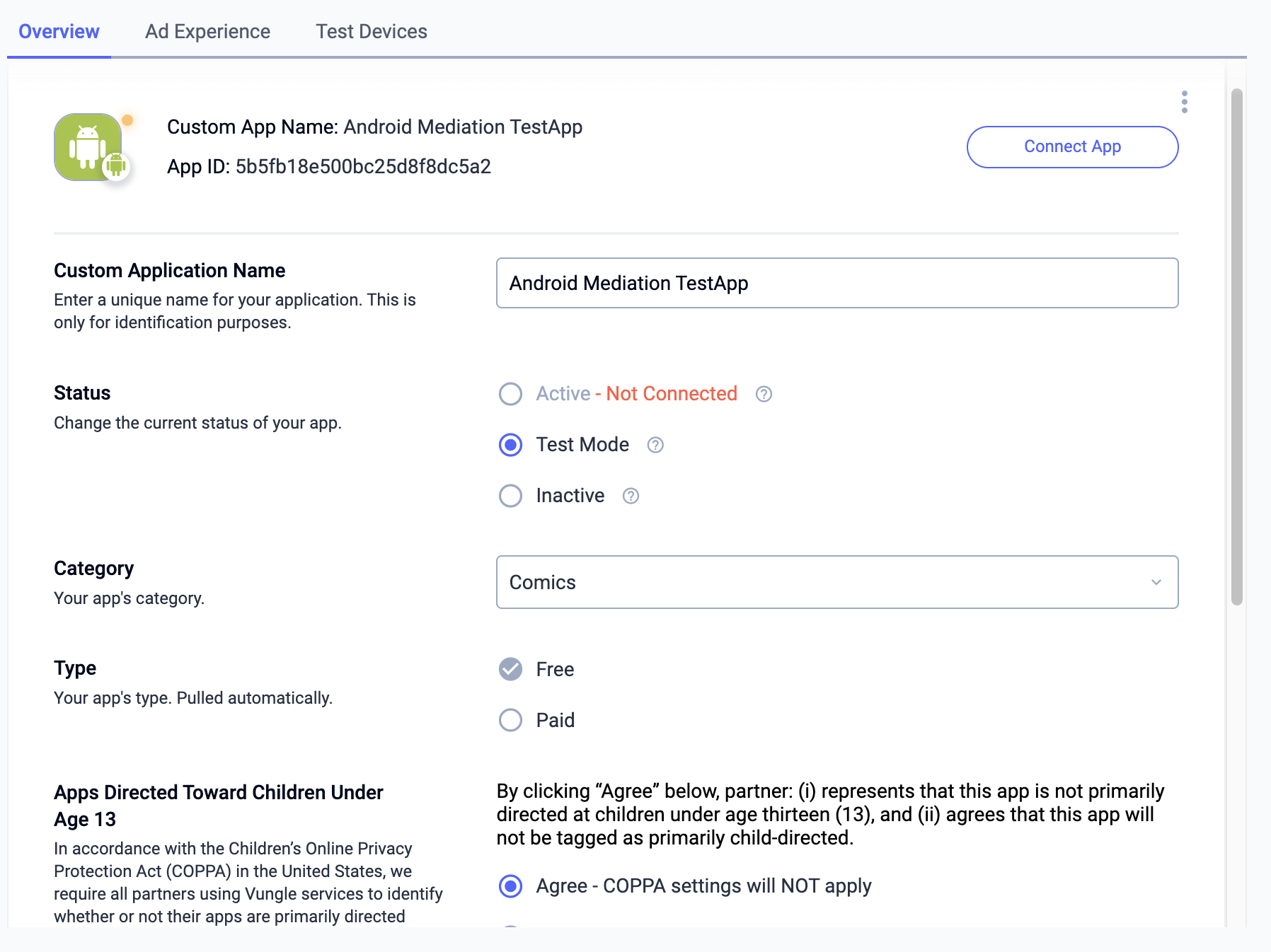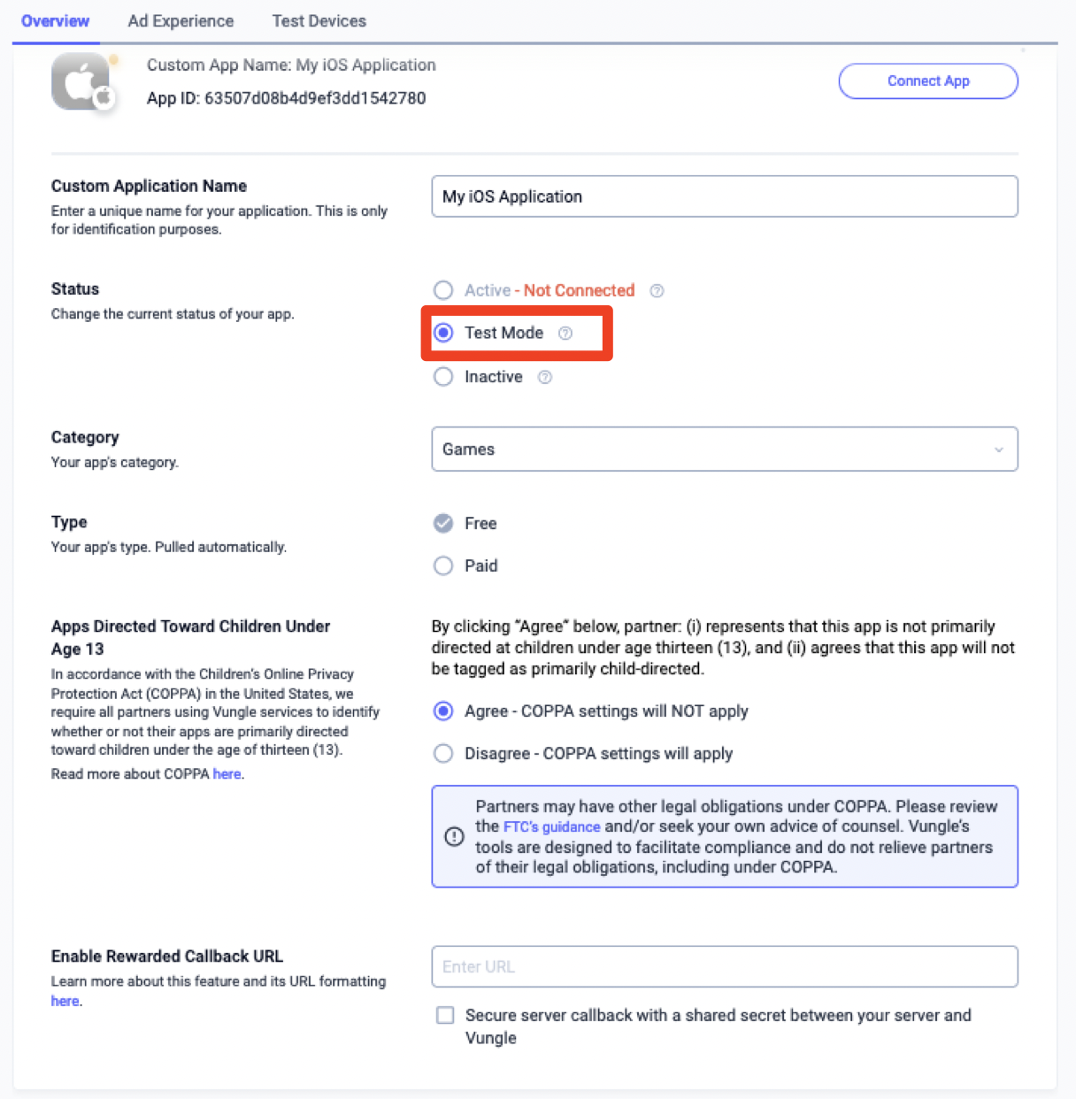 Select your app for which you would like to enable test ads under the Placement Reference ID section of your app. Test ads can be enabled by selecting Test Mode to Show test ads only under the Status section.