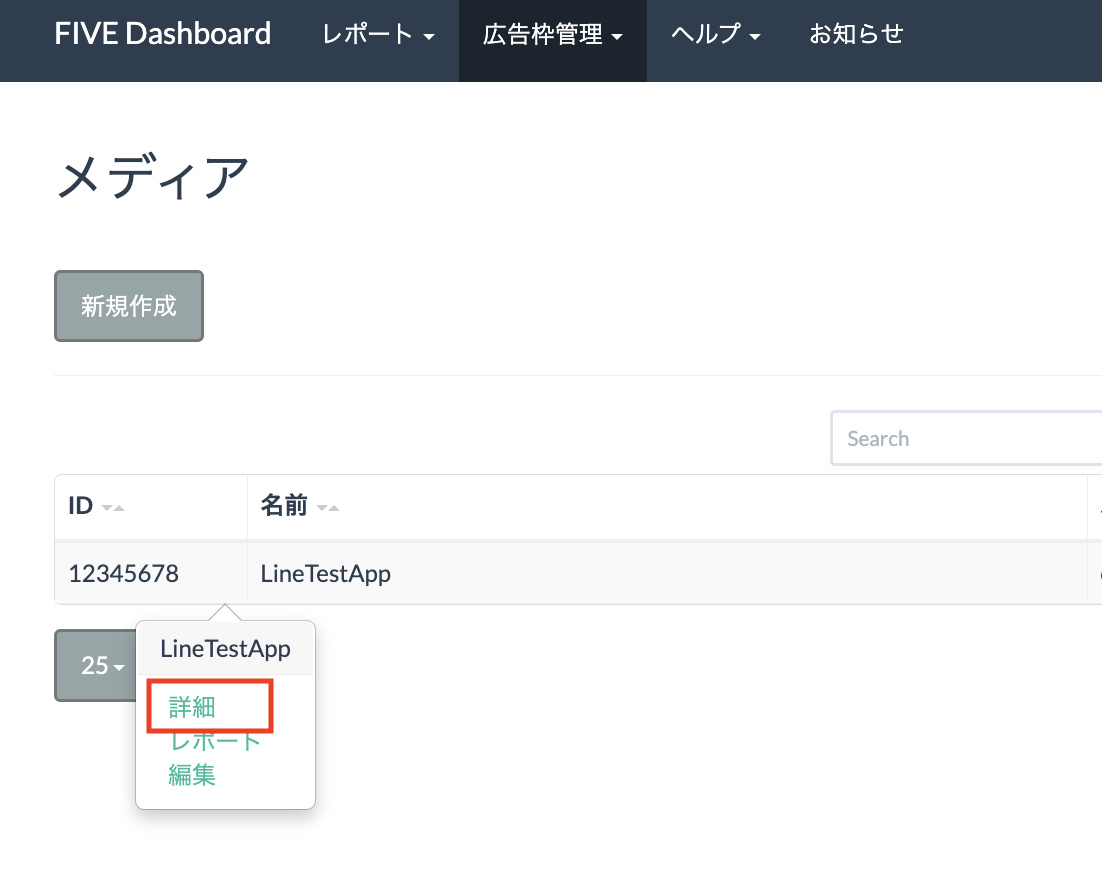 Click the ID of the application you want to add an ad placement. Then, select 詳細 (Detail).