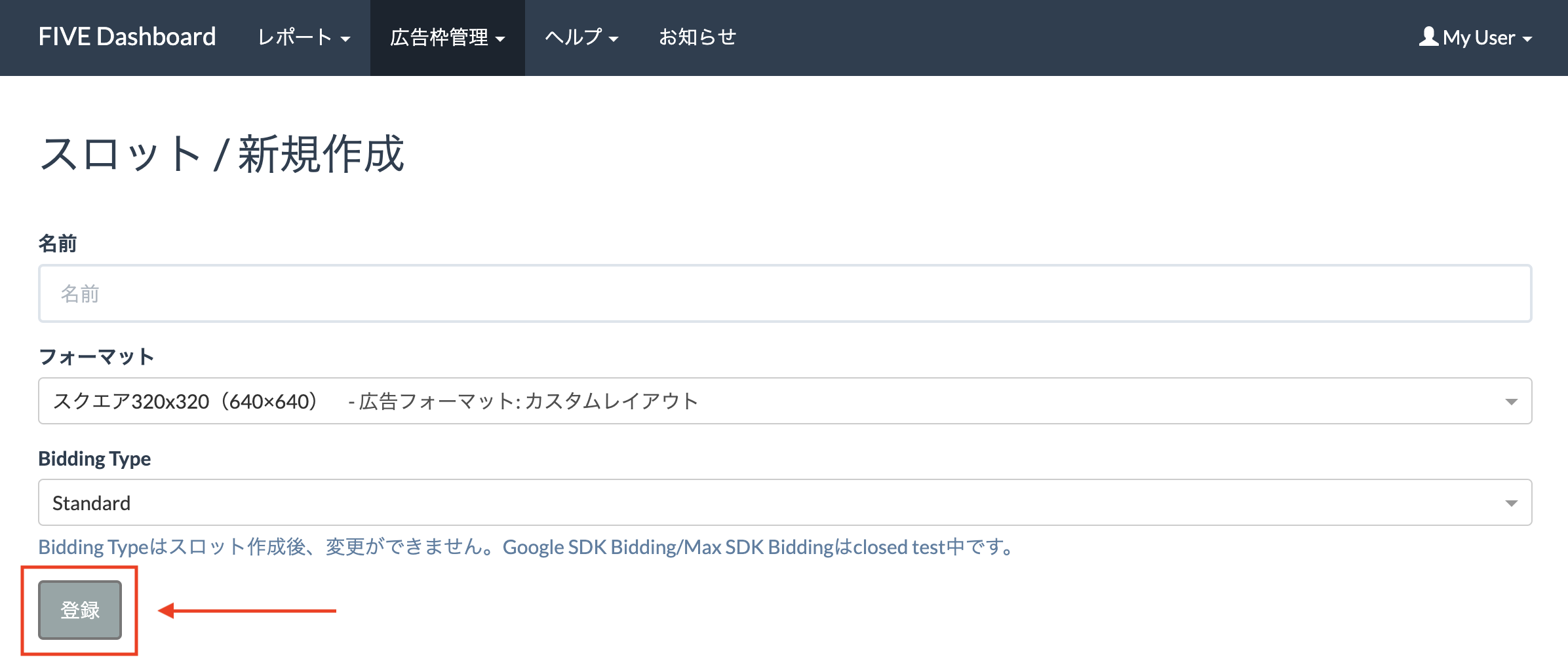 Fill out the form for details about the slot. For Bidding Type, select Standard to configure this slot for waterfall mediation, or Google SDK Bidding to configure this slot for Bidding. Click 登録 (Register) once the form is filled.