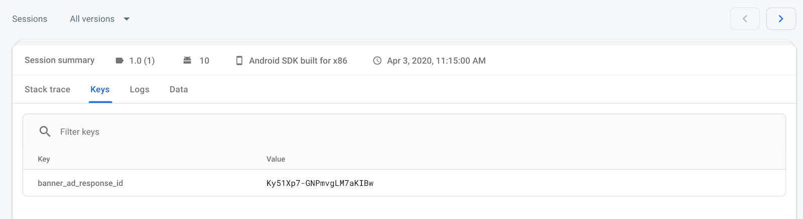 section of crash sessions on your Crashlytics dashboard. Note that some keys may