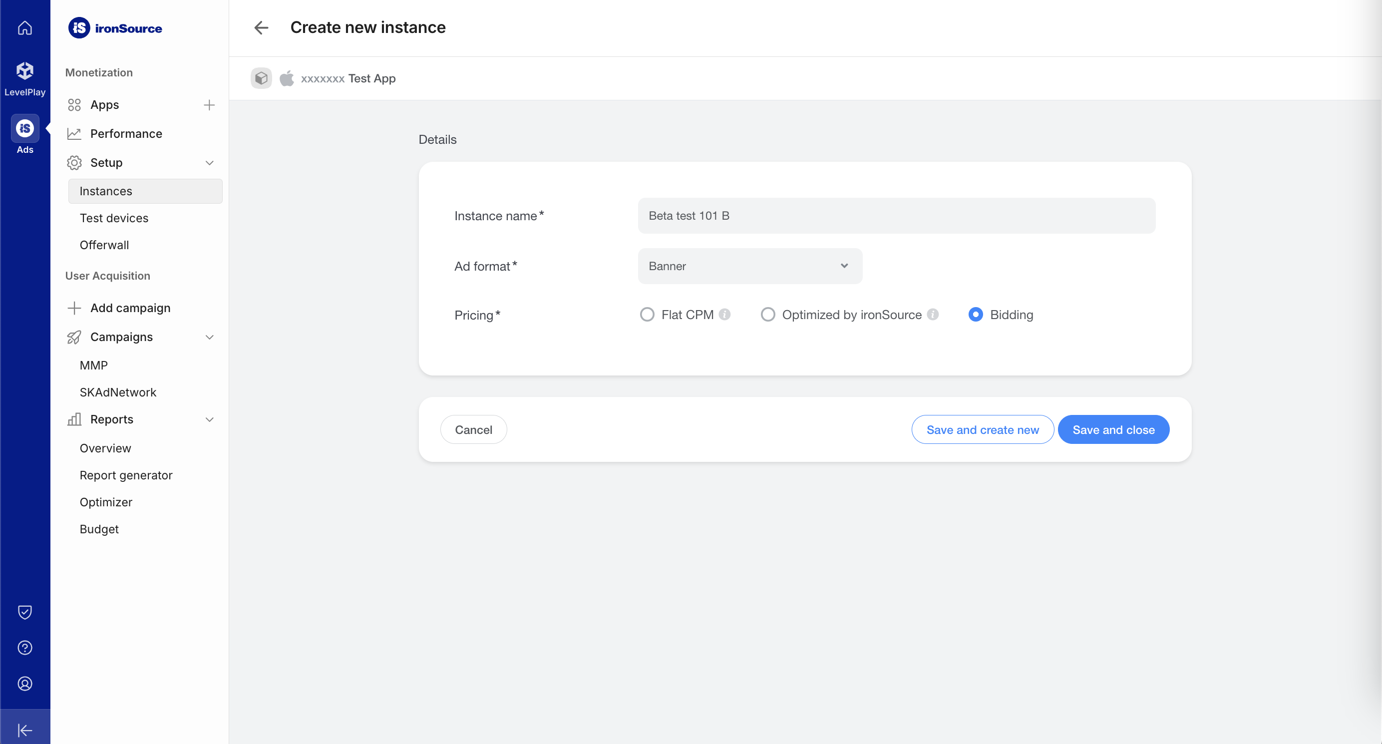 Navigate to Ads > Setup > Instances. Select the app and click Create instance.