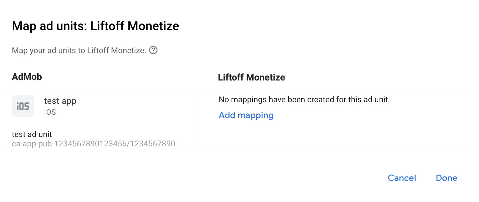 If you already have a mapping for Liftoff Monetize, you can select it. Otherwise, click Add mapping.