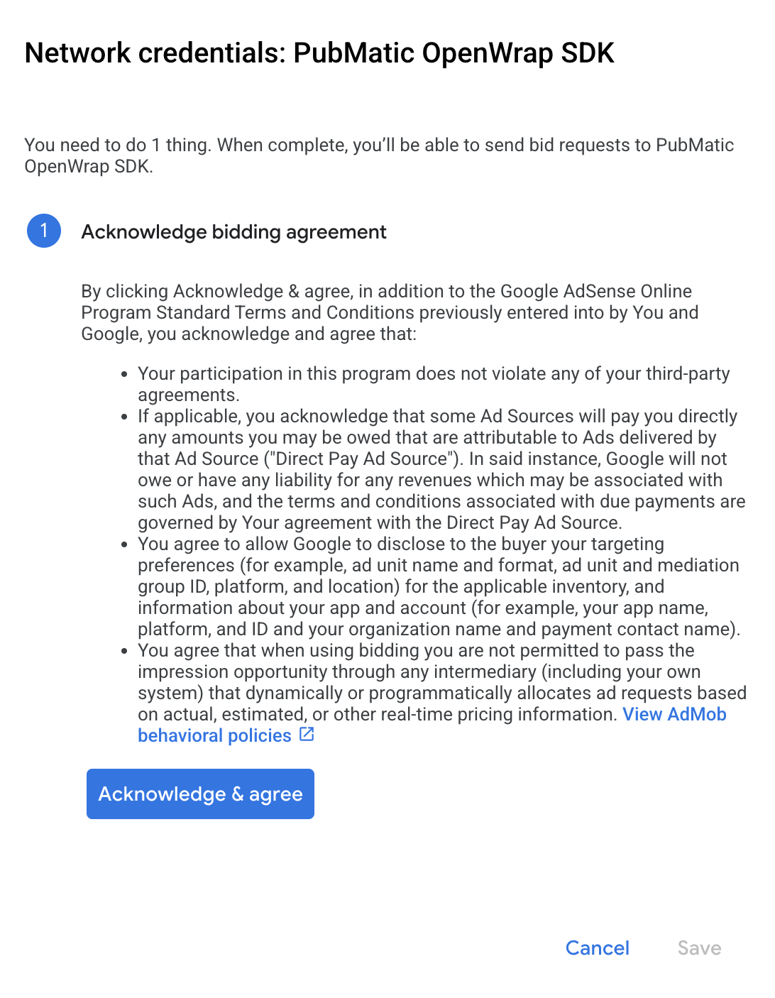 Follow the steps in European regulations settings and US state regulations settings to add PubMatic to the European and US state regulations ad partners list in the AdMob UI.