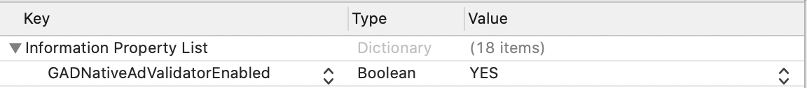 [[["Easy to understand","easyToUnderstand","thumb-up"],["Solved my problem","solvedMyProblem","thumb-up"],["Other","otherUp","thumb-up"]],[["Missing the information I need","missingTheInformationINeed","thumb-down"],["Too complicated / too many steps","tooComplicatedTooManySteps","thumb-down"],["Out of date","outOfDate","thumb-down"],["Samples / code issue","samplesCodeIssue","thumb-down"],["Other","otherDown","thumb-down"]],["Last updated 2025-12-11 UTC."],[],["Native Validator, available in Google Mobile Ads SDK 7.68.0 or higher, identifies AdMob policy violations in native ad placements within test ads. It displays an overlay popup next to the ad, alerting users to potential issues and providing a fullscreen list of violations when \"See Issues\" is clicked. Enabled by default for test ads on test devices, it can be disabled by setting `GADNativeAdValidatorEnabled` to `false` in the `Info.plist`, which prevents it from showing policy violations.\n"]]