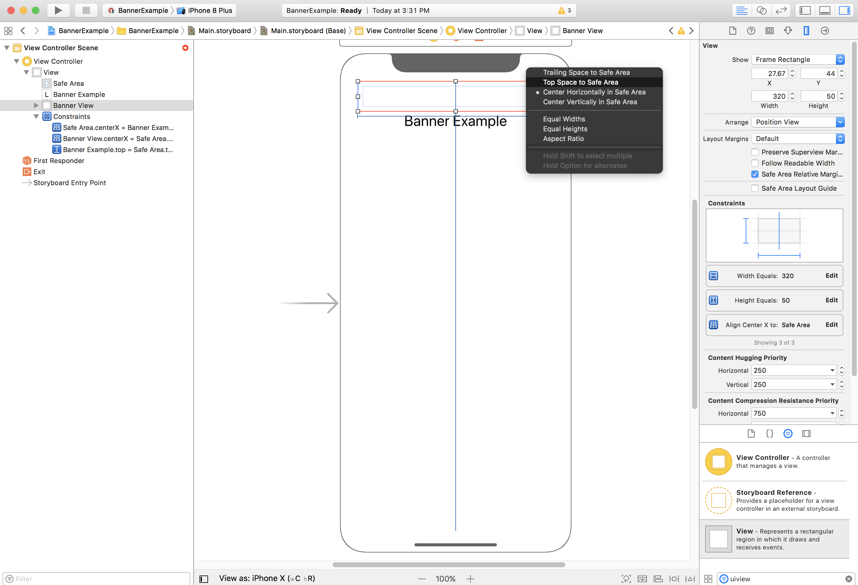 Banner ads must be placed in the "Safe Area" to avoid being obscured by rounded corners, sensor housing, and the Home indicator. On this page you'll find examples of how to add constraints to position a banner to the top or bottom of the Safe Area.