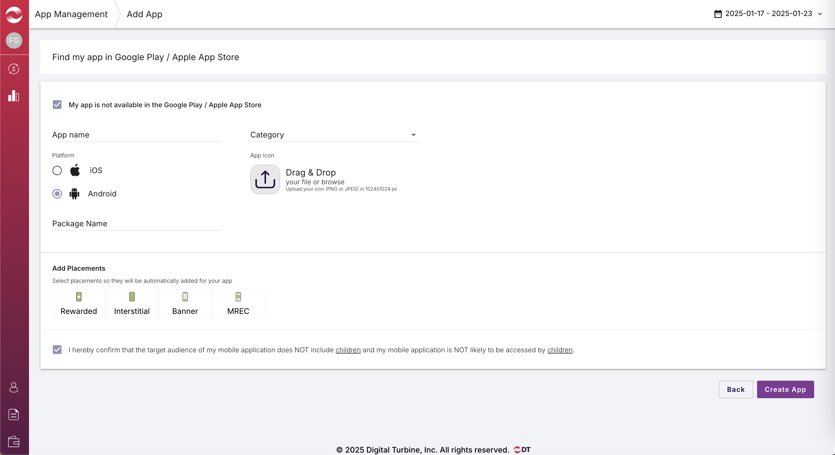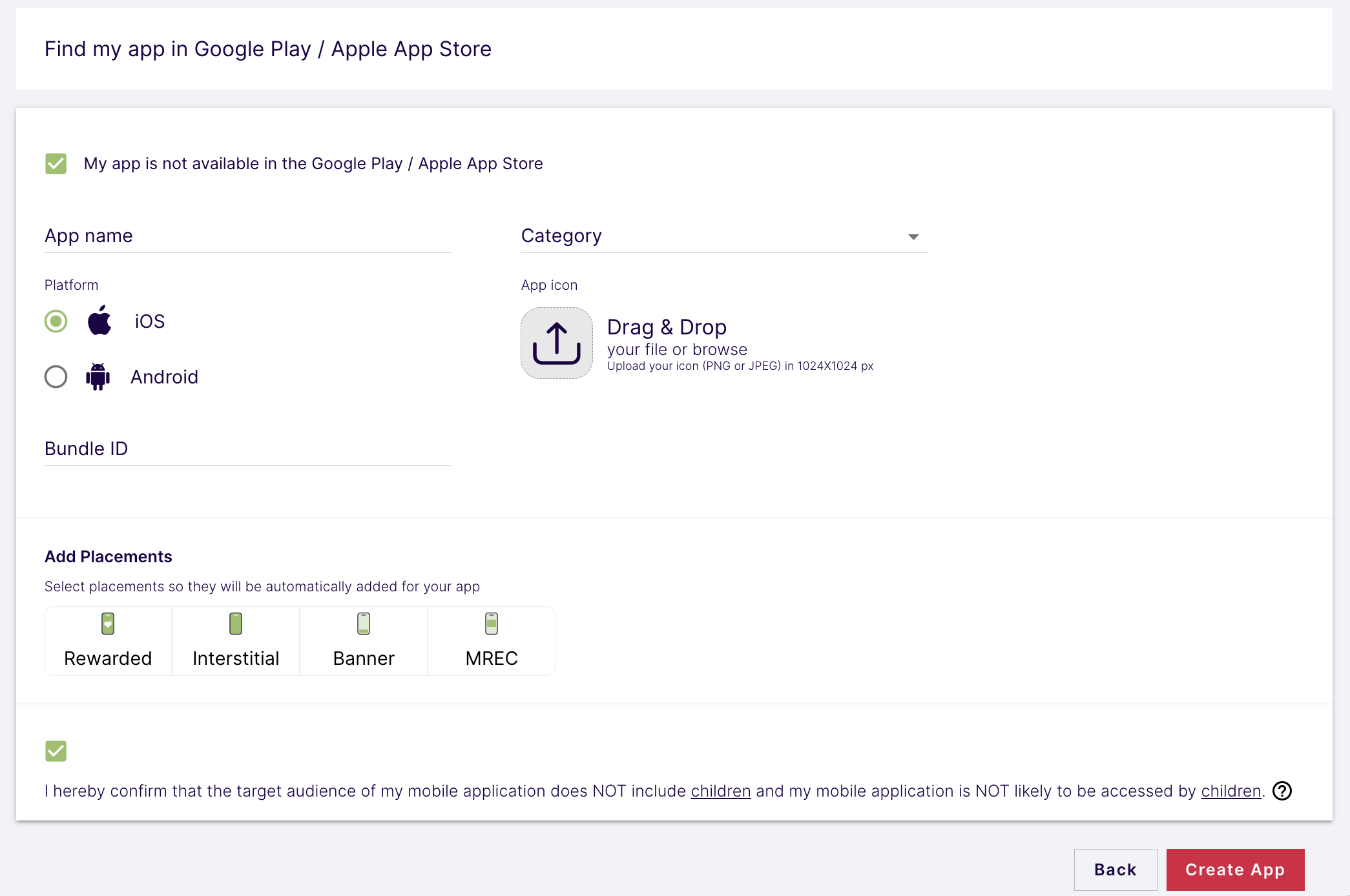 Choose your platform and placements, fill out the rest of the form, and then click Create App.
