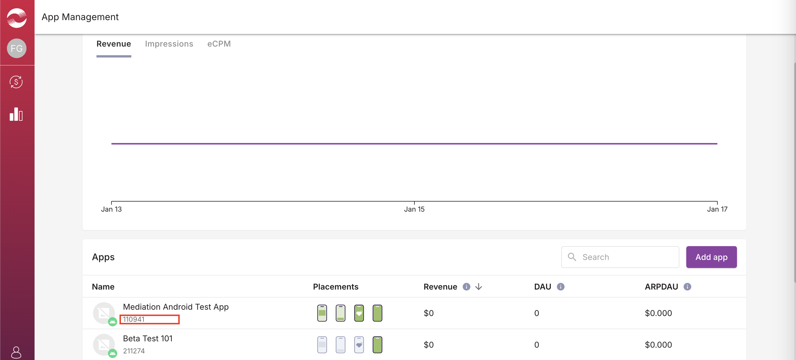 Select your app and navigate to the Placements tab. Take note of the Placement ID..