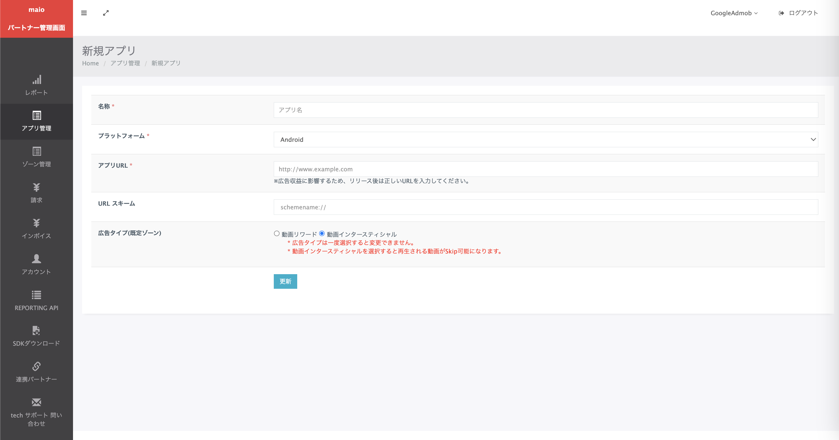 Enter the Name of your app, select the platform and provide your App URL. Select Video interstitial as the Ad Type, and then click Update.